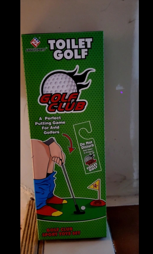 A golf putting game that can be used in your bathroom. Includes a putting green, a cup with flag, two golf balls, a putter and a "Do Not Disturb" door hanger. New still in original box.