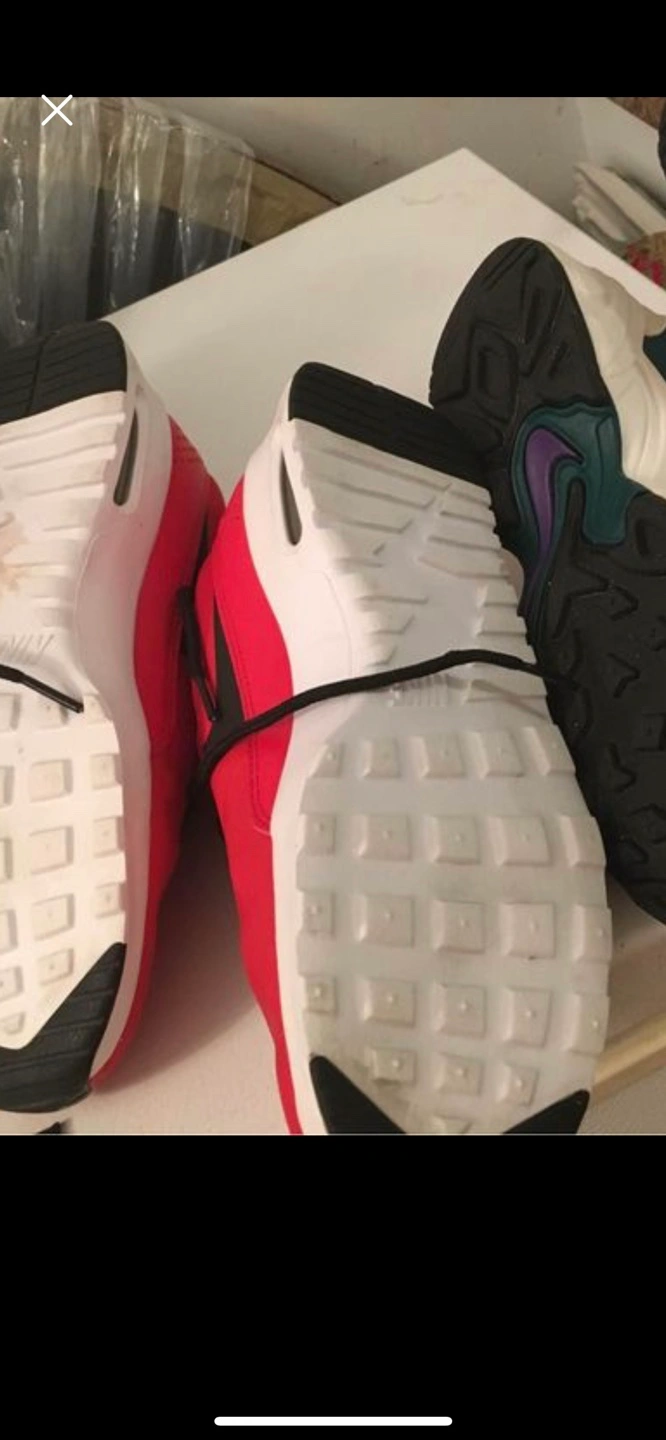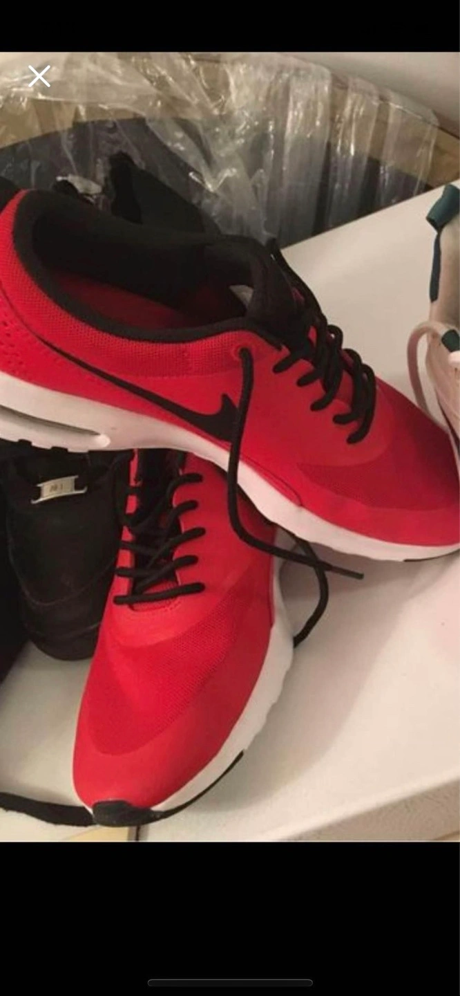 Red running shoes with black laces and a white sole. For women size 7 use one time because of tight