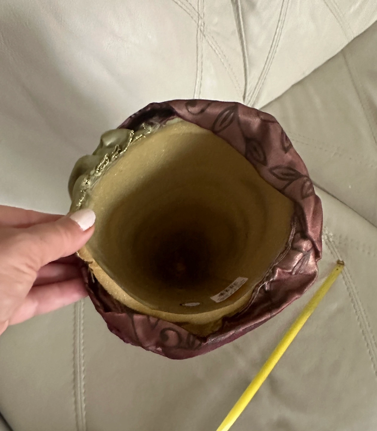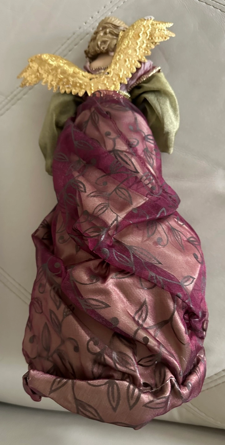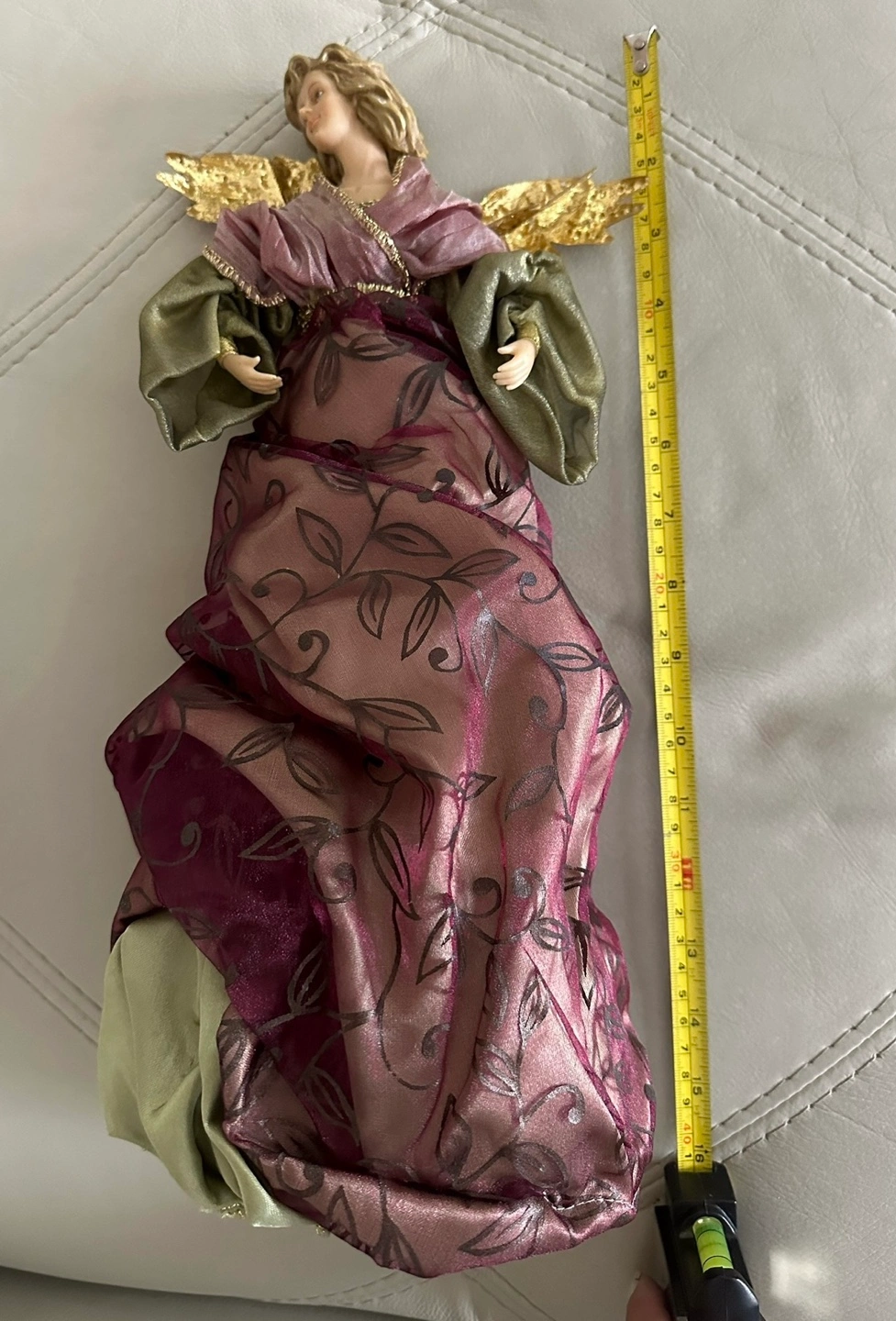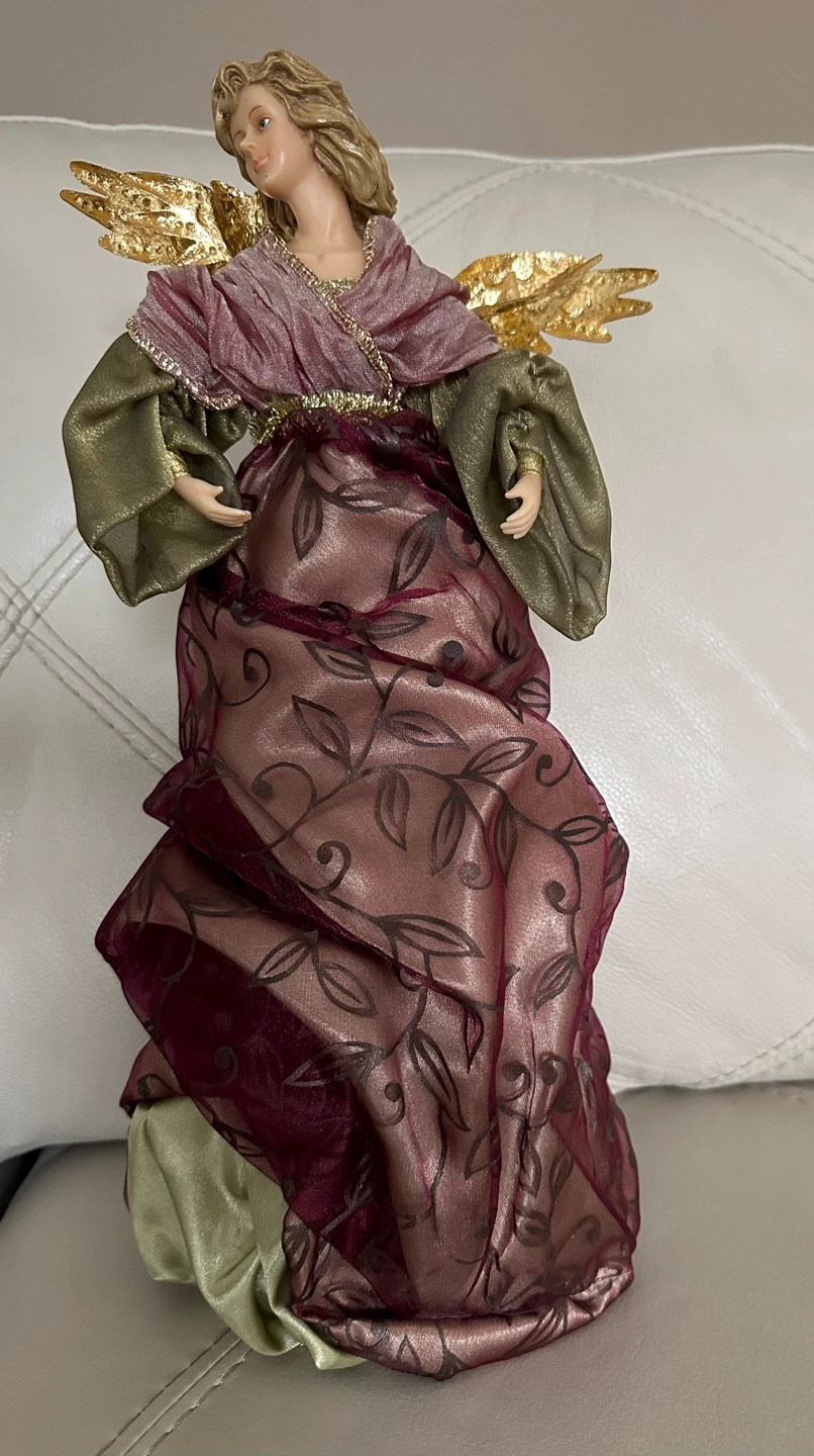 Large angel figurine with gold wings and a burgundy and green dress. Approximately 18 inches tall. Designed to be placed on a Christmas tree.