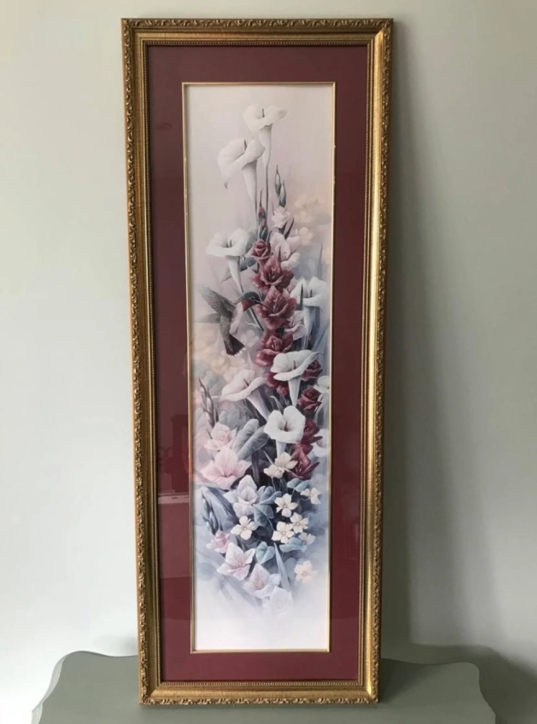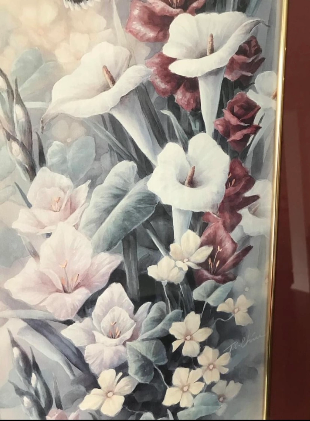 Beautiful Floral Print with nice frame. Gold frame with a maroon mat. In excellent condition.