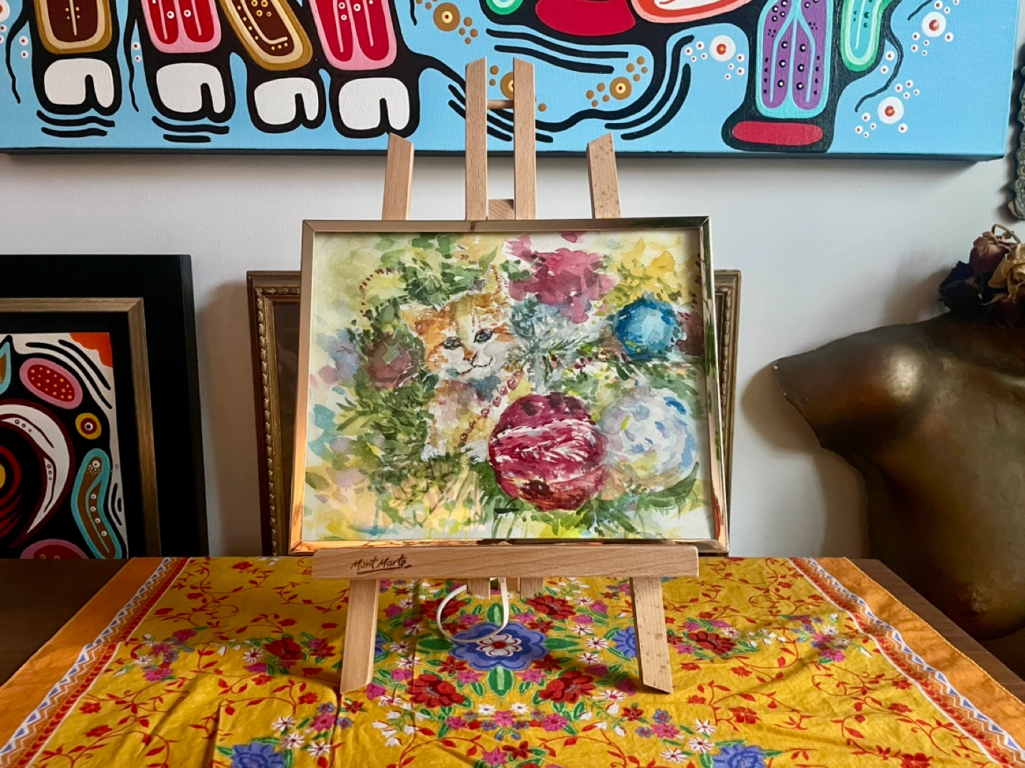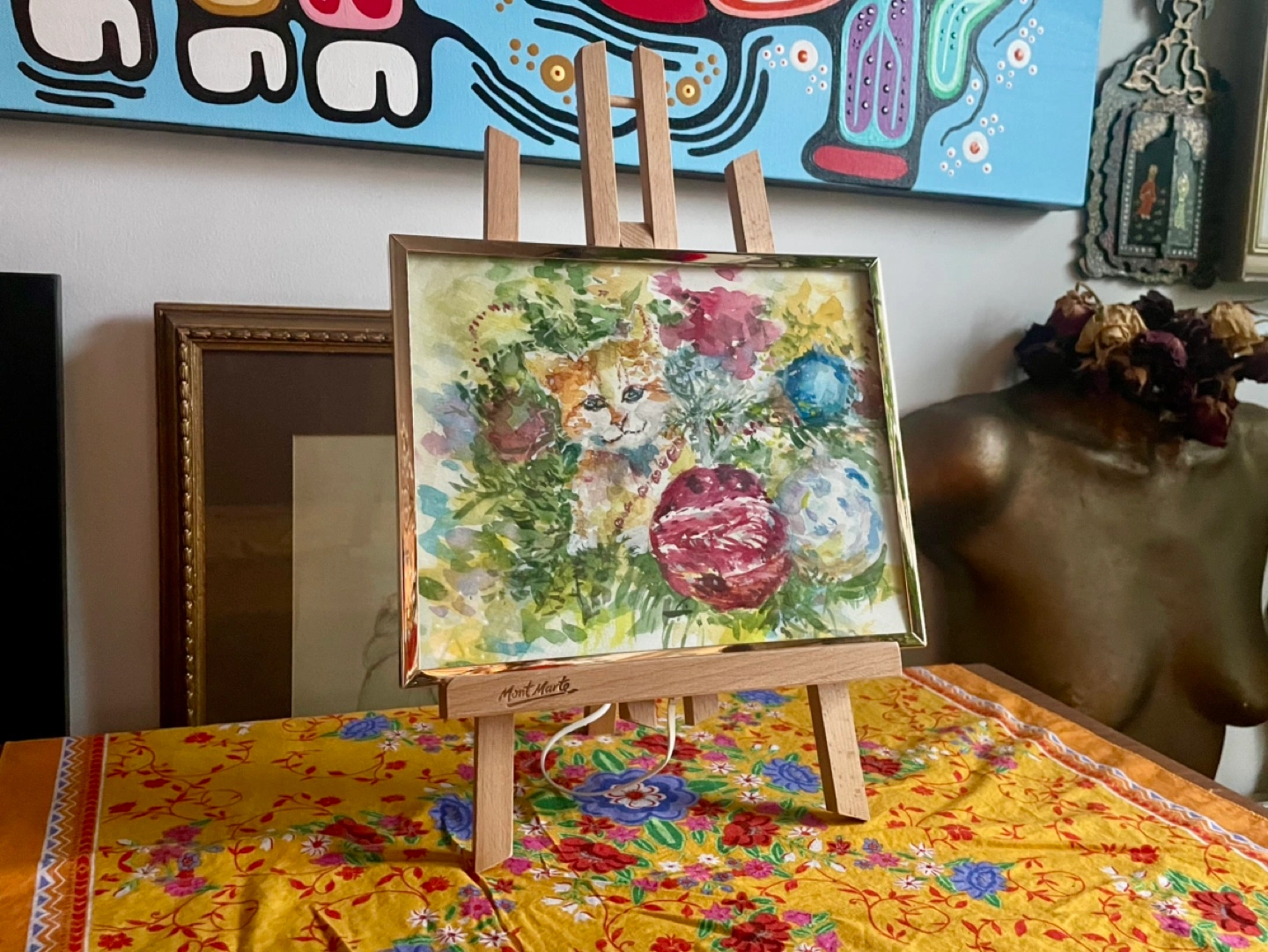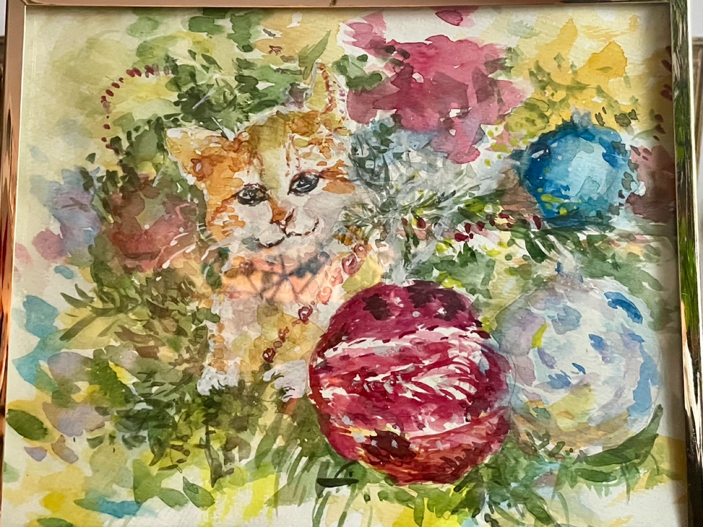 Frames watercolour drawing on paper done by me, featuring a festive and playful scene with a small cat surrounded by holiday decorations. The cat, with bright, curious eyes and a cheerful expression, is nestled among vibrant greenery, adorned with colorful ornaments. Warm and whimsical, evoking a festive, holiday spirit with a touch of charm and mischief typical of cats. 8” x 10” Pick up around Sherbourne/ Wellesley Could ship/ deliver for a fee