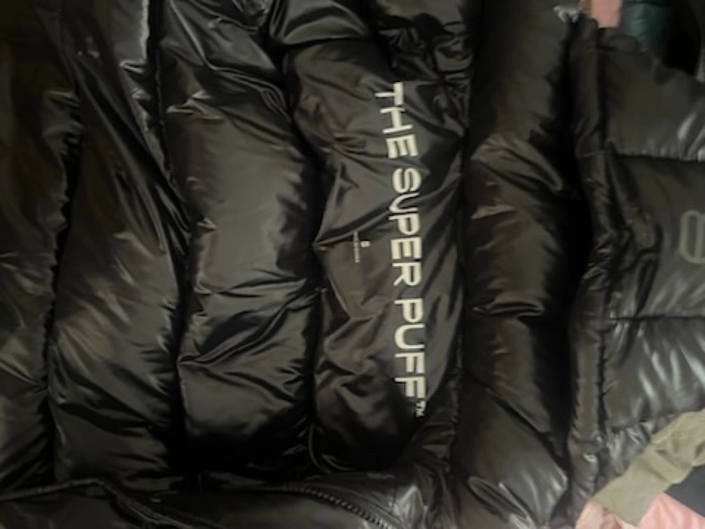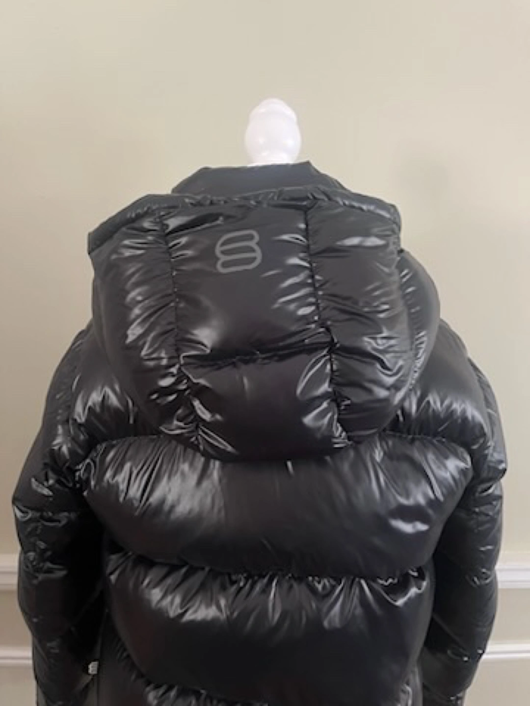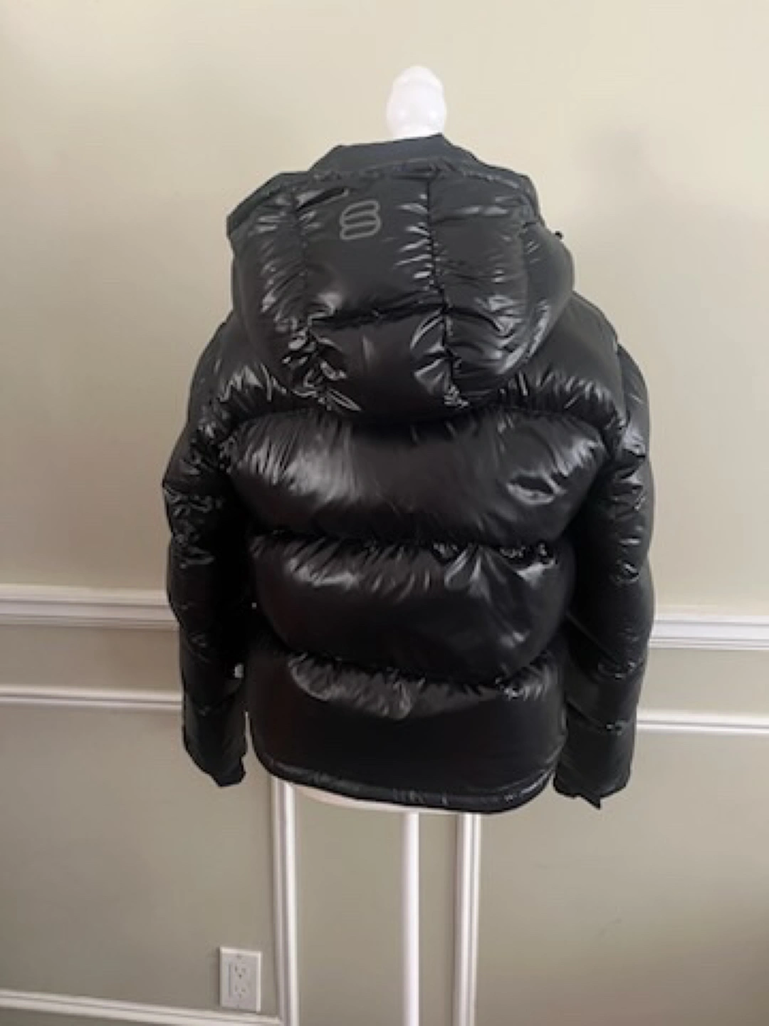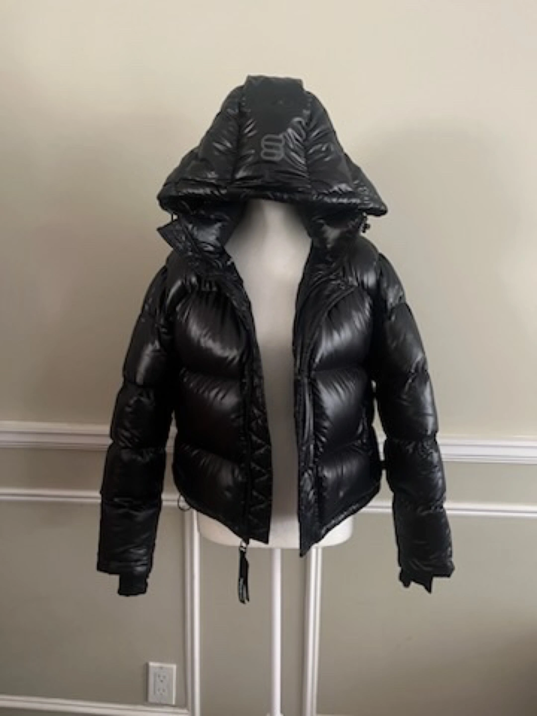 Black short puffer jacket with a hood. Features a shiny, quilted exterior and a zipper closure. Includes a brand tag and logo on the back.
