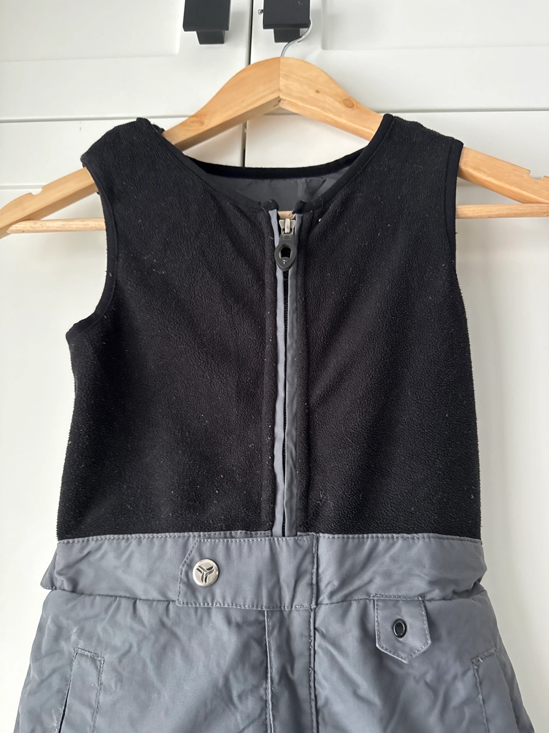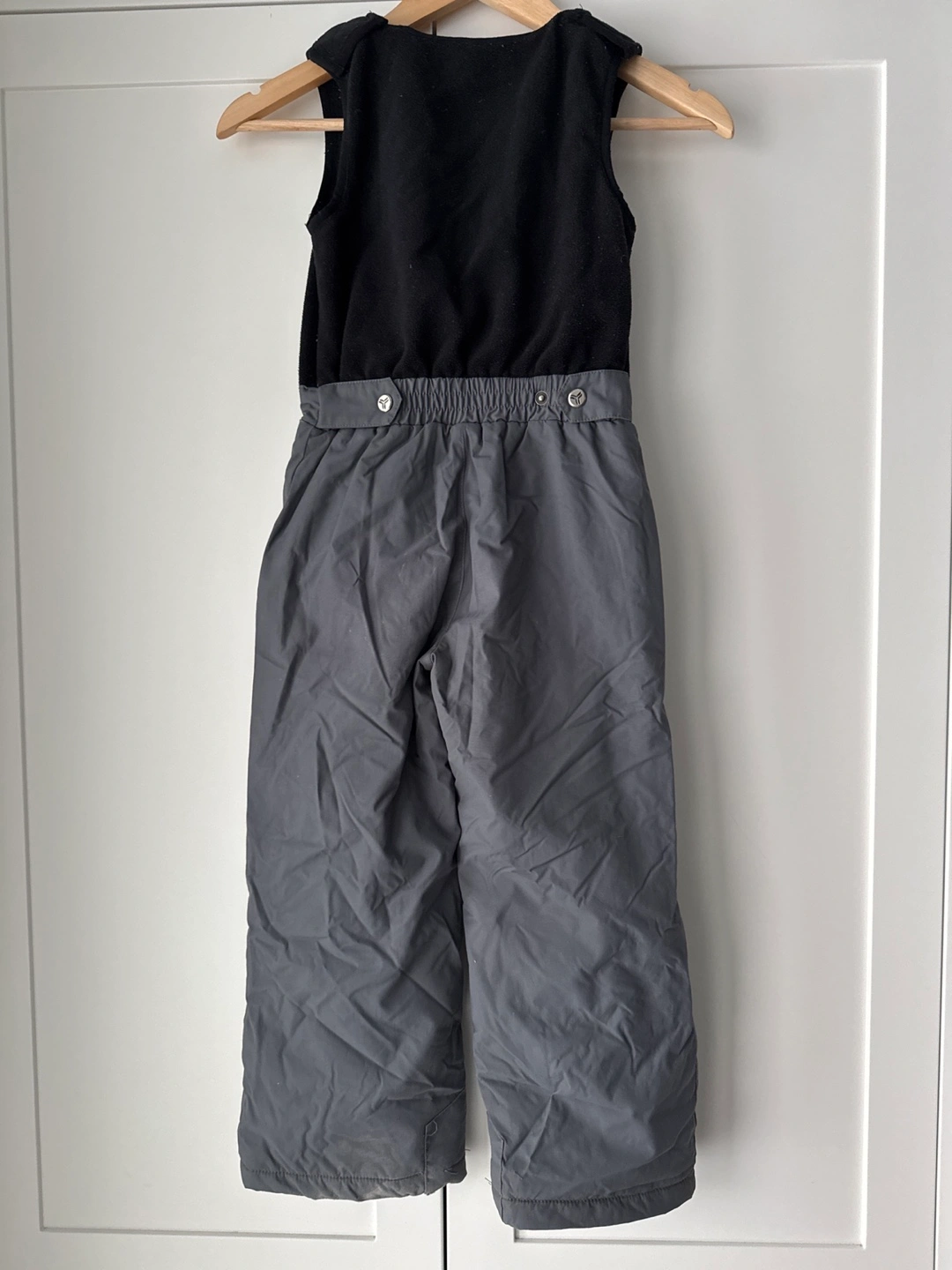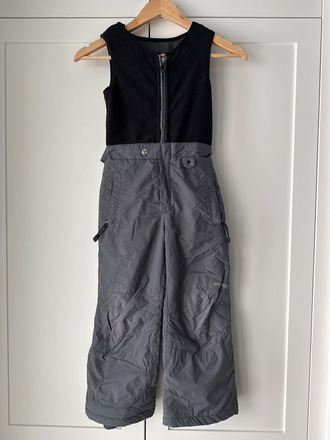 Grey and black ski/snow pants. Fleece lining on the top half of the pants. Waist is elastic and adjustable. Used for snowboarding.