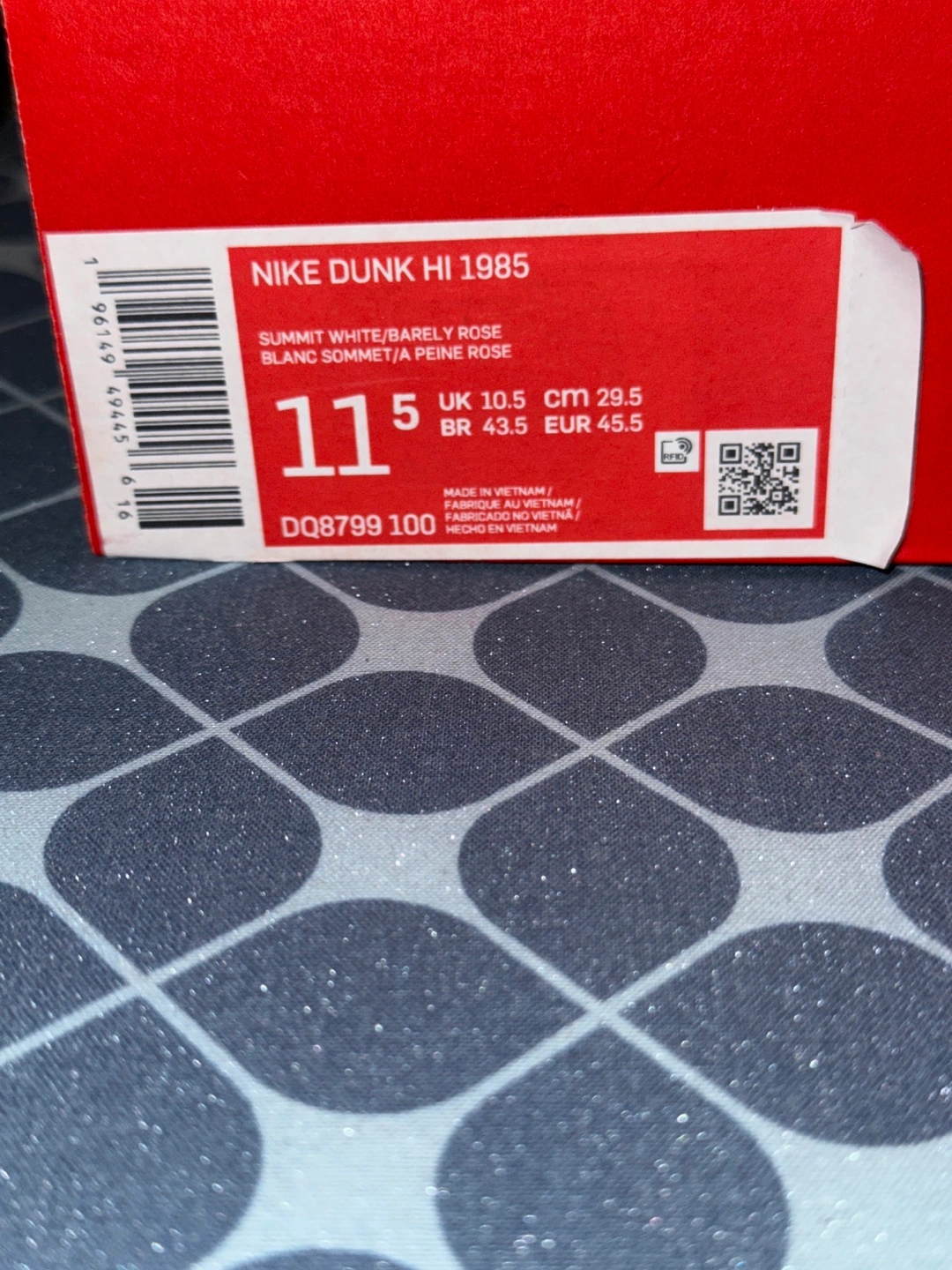 Nike Dunk High 1985 in Summit White/Barely Rose. Men's Size 11.5.