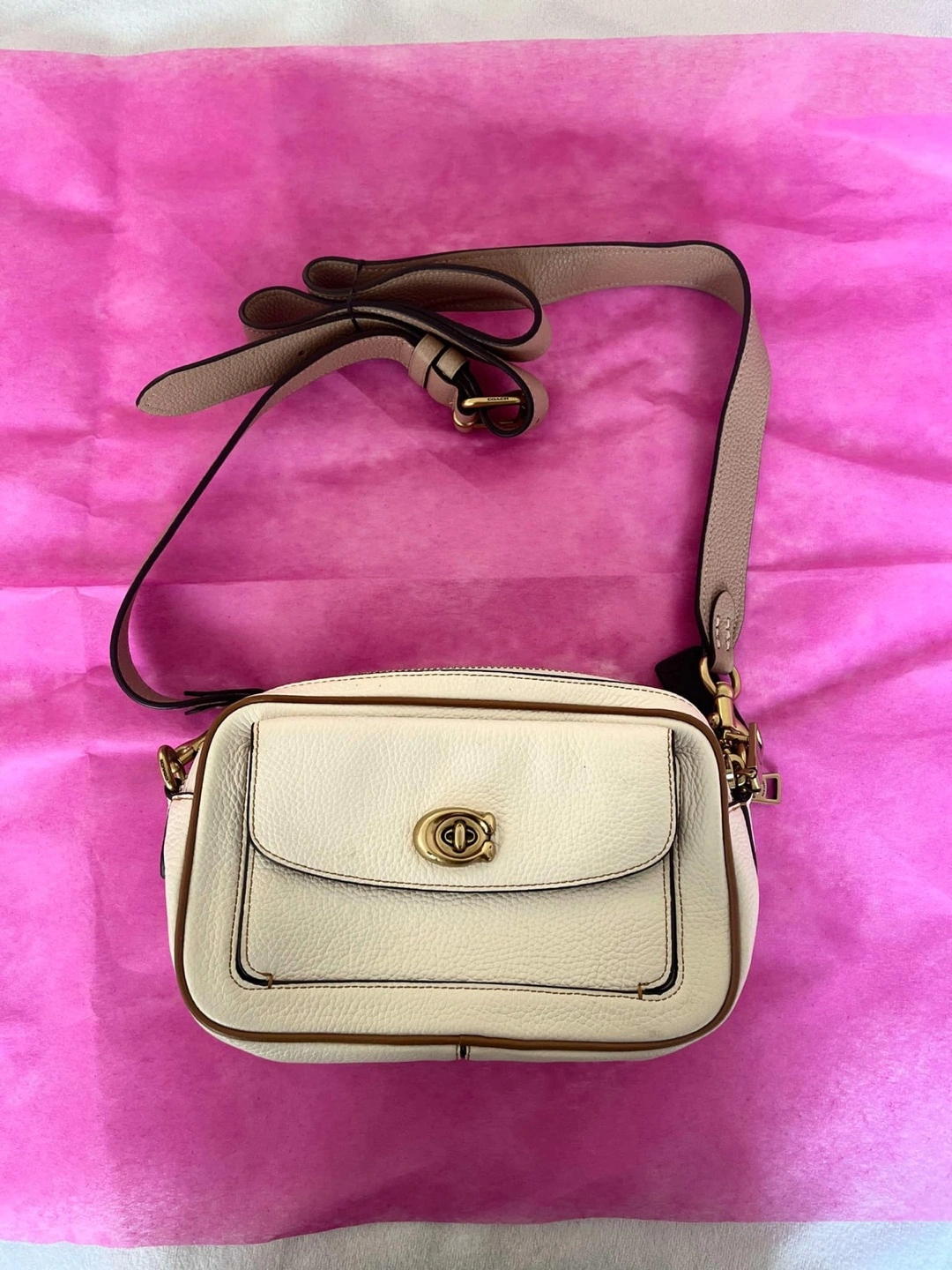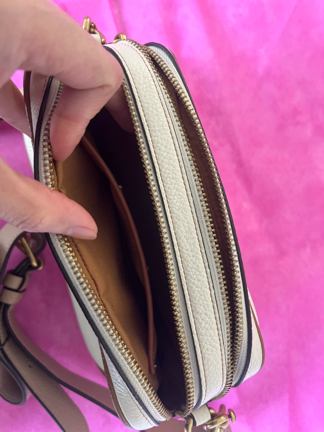 Small white leather Camera bag with brown trim and gold hardware. Has an adjustable strap. Interior has two zipper pocket and two open pockets.