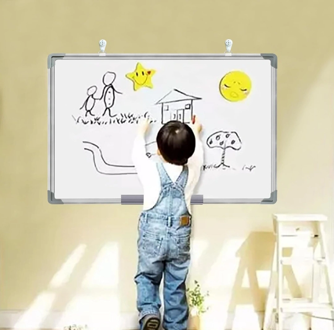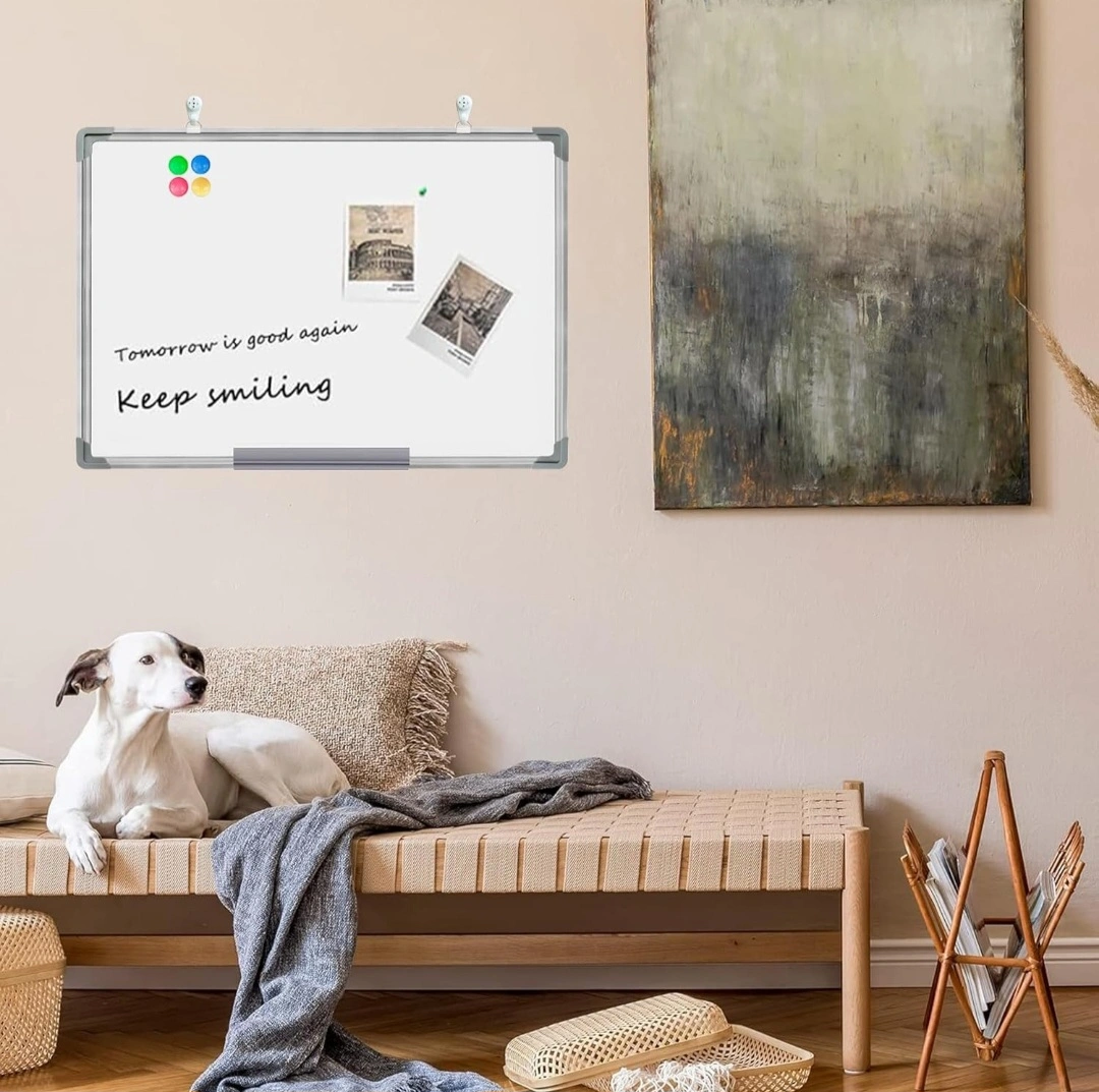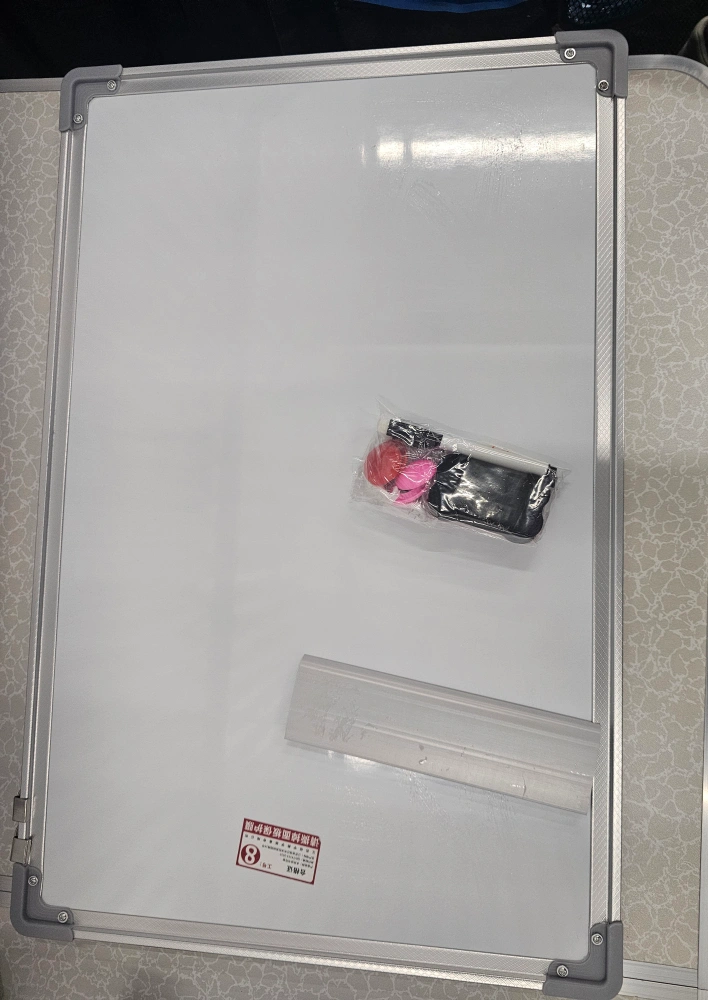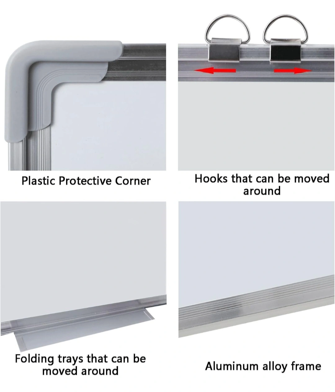 Whiteboard with aluminum frame, includes eraser, marker, magnets, and hanging hooks. Protective corners and folding trays.15-23"