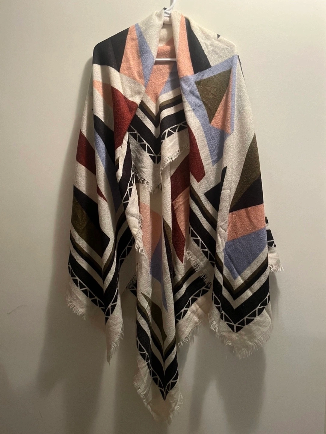 Large, white scarf with geometric pattern in various colours. Features a fringe border.