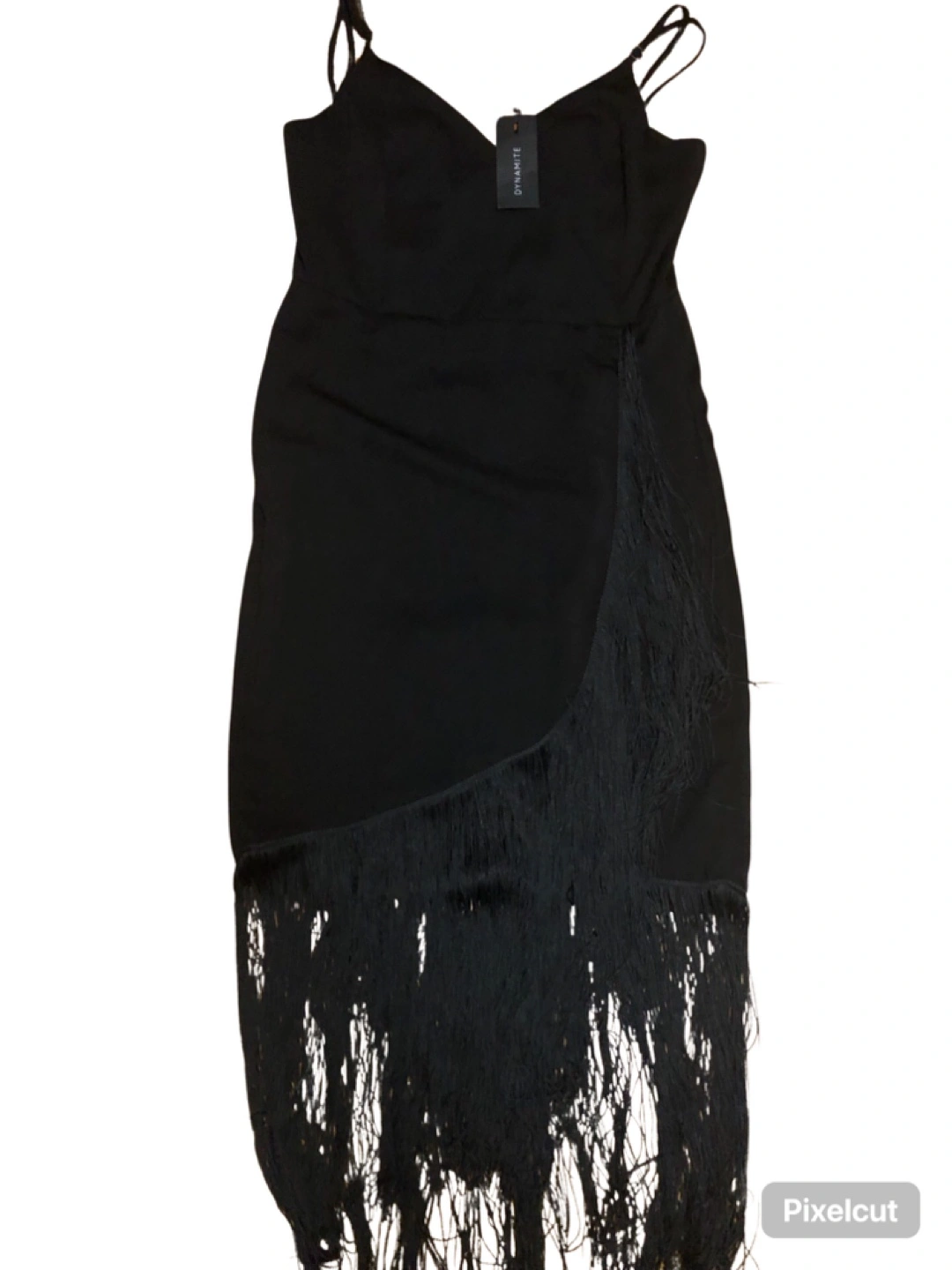 Black spaghetti strap dress with fringe detail. Brand new with tag. Would look great for the holiday season