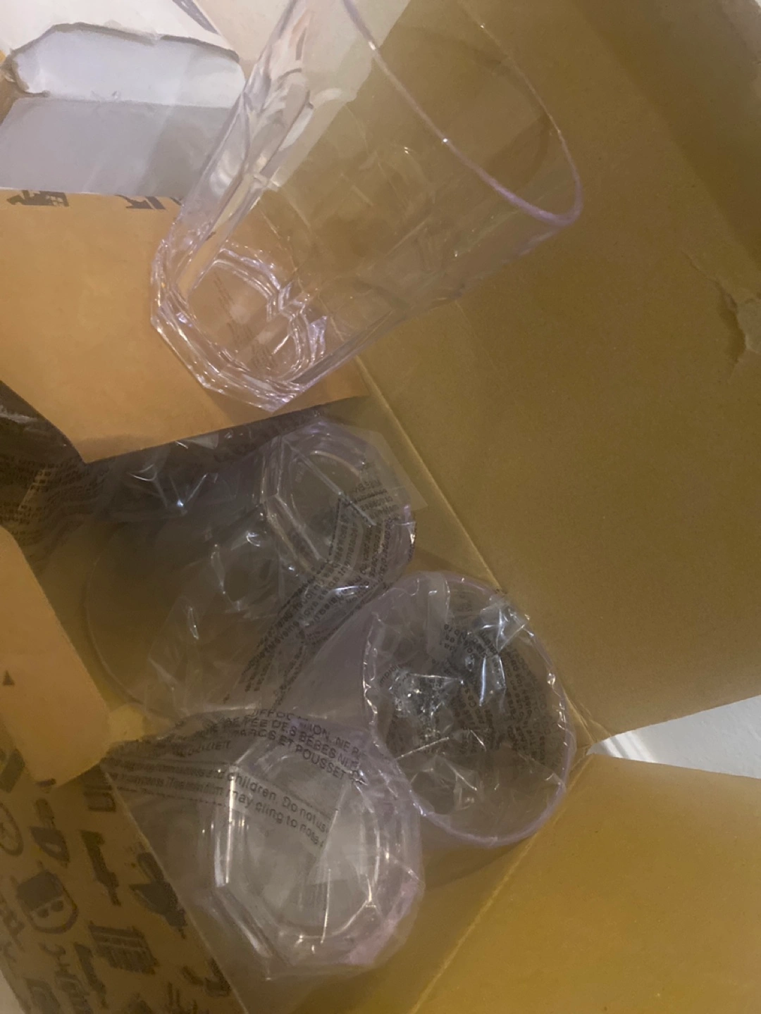 881Set of 6 clear plastic tumblers. Top rack dishwasher safe. BPA-free. Durable plastic material. 4.3 inches tall, 3.5 inches mouth diameter.