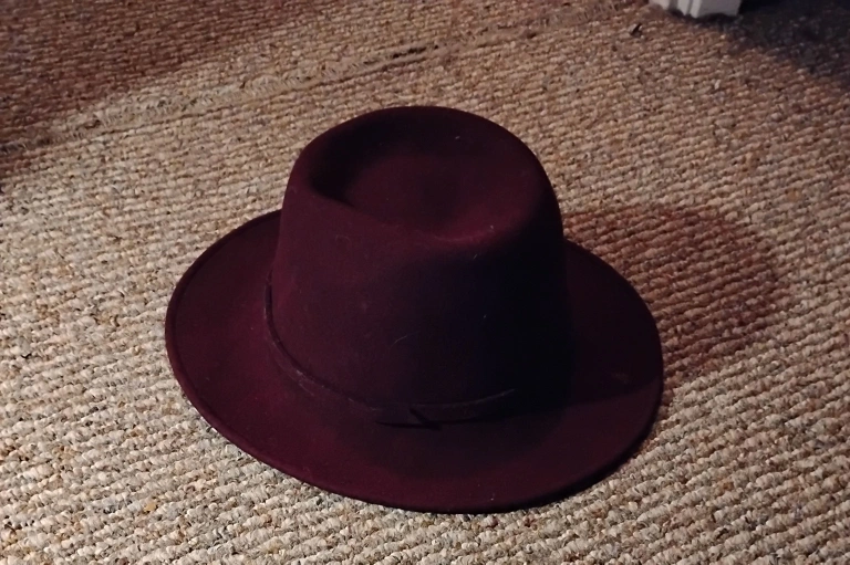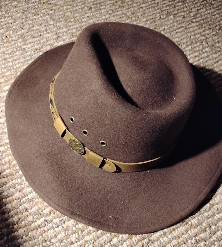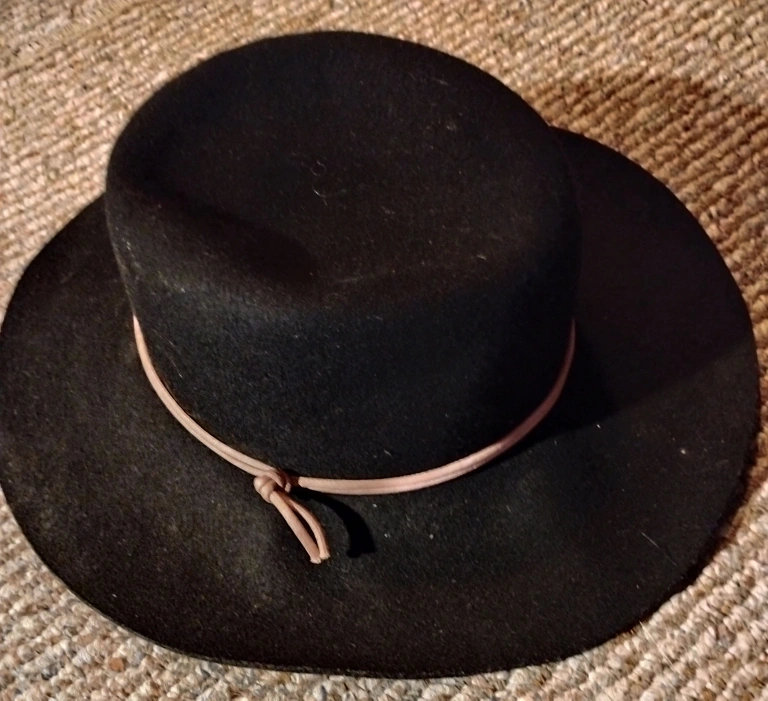 Three Wool felt hats in black, burgundy and brown. All have leather bands. The brown hat has a metal emblem with a horse on it. (AUSTRALIA)