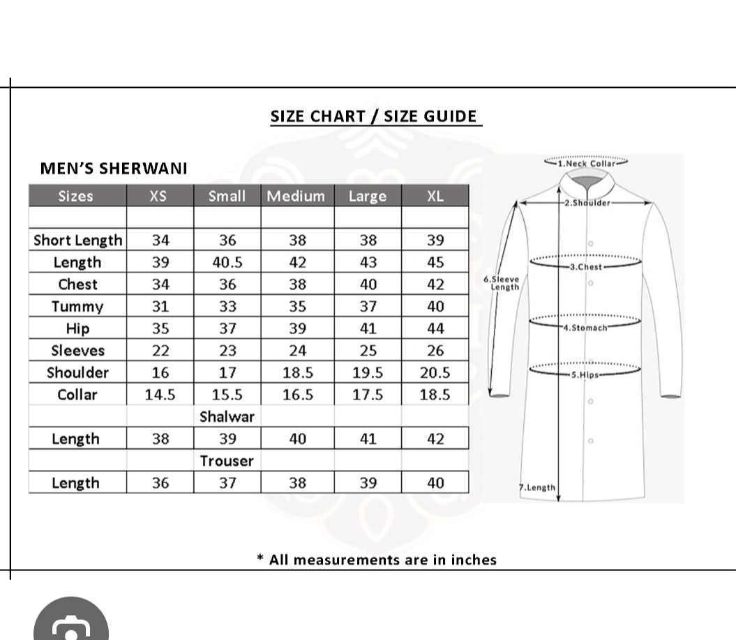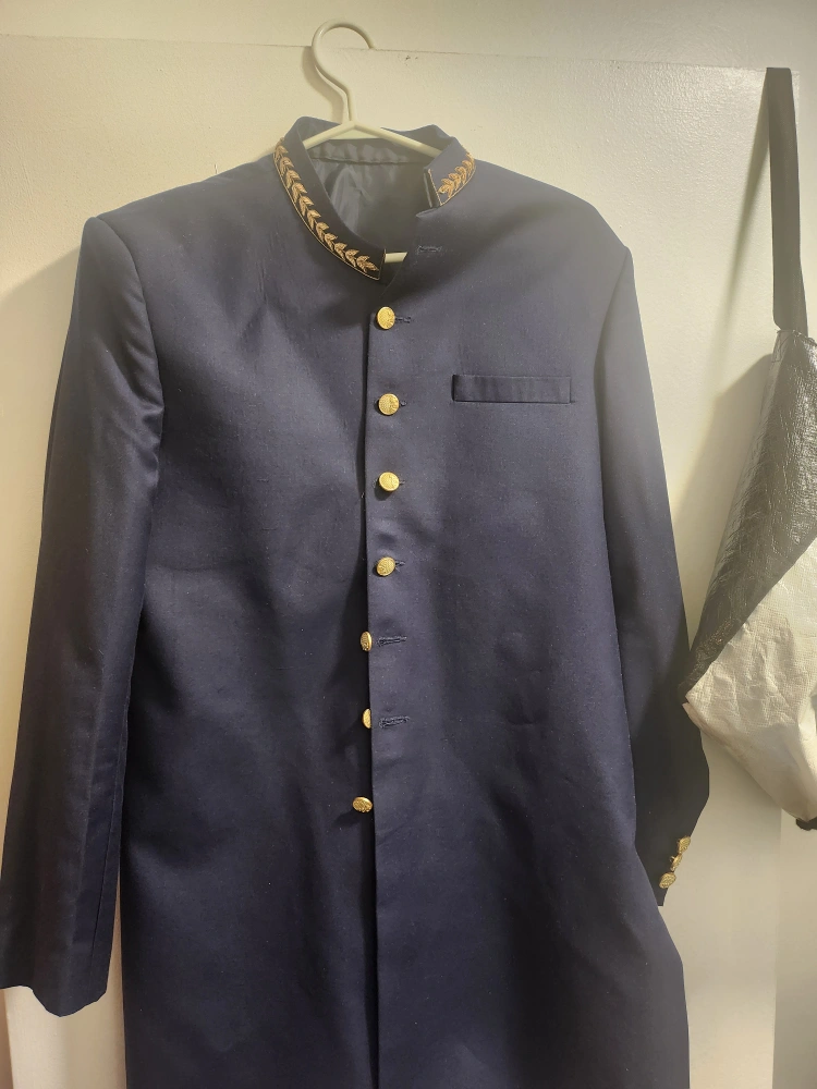Navy blue Sherwani with gold trim and buttons. Long sleeves and a mandarin collar. Perfect for a special occasion.