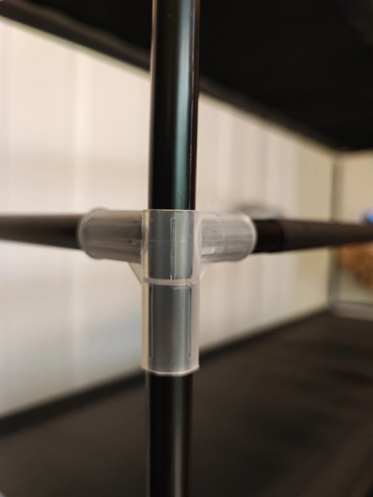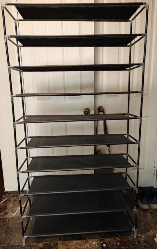 Black metal and fabric shoe rack. Eight shelves. Easy to assemble. Great for organizing your shoe collection.