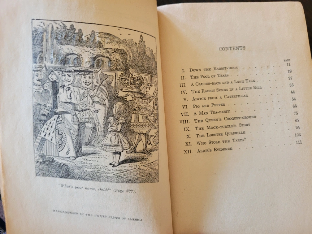 Vintage hardback book with illustrations by John Tenniel. Teal cover with a decorative tree on the front. Published by Books, Inc.
