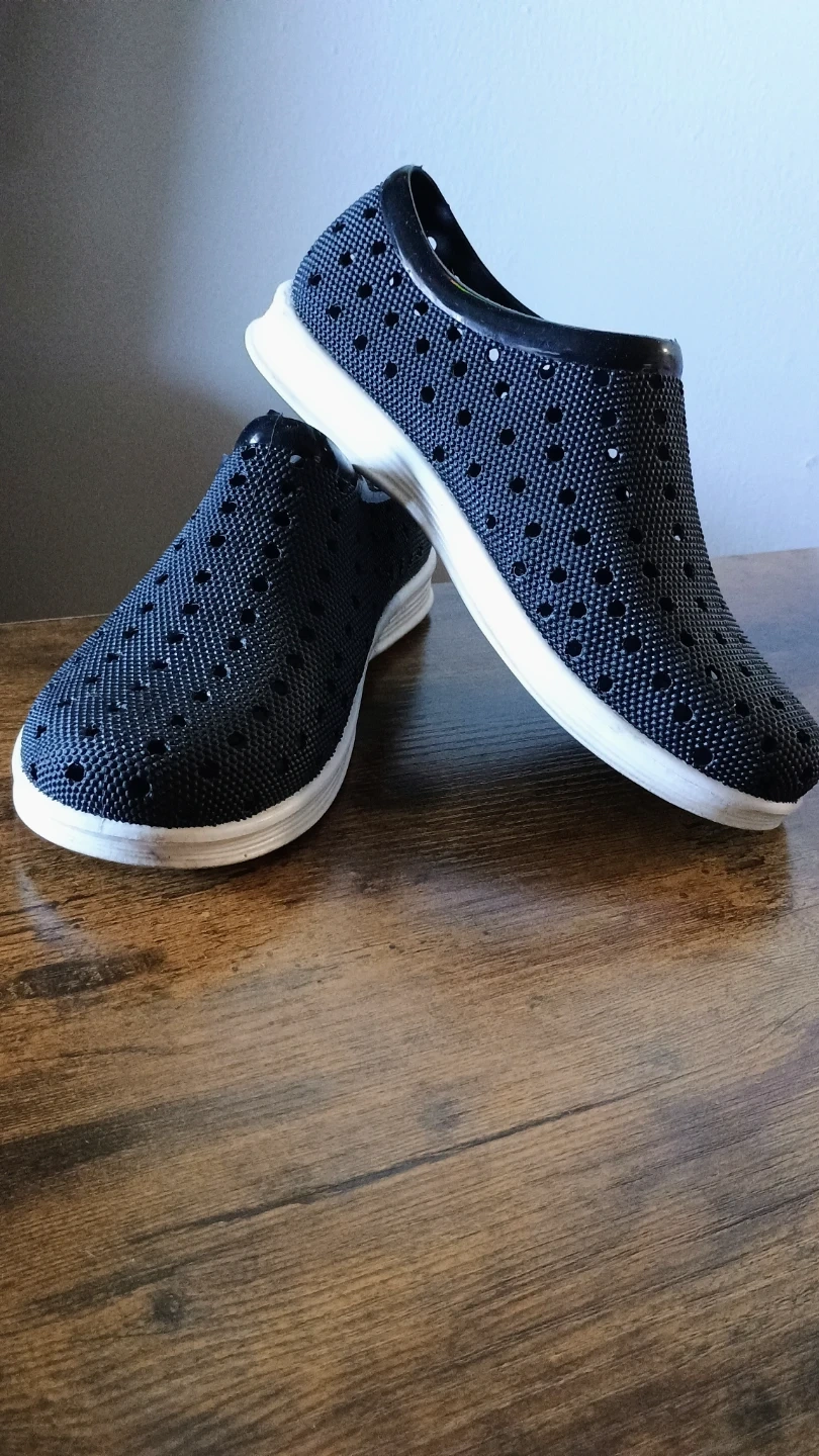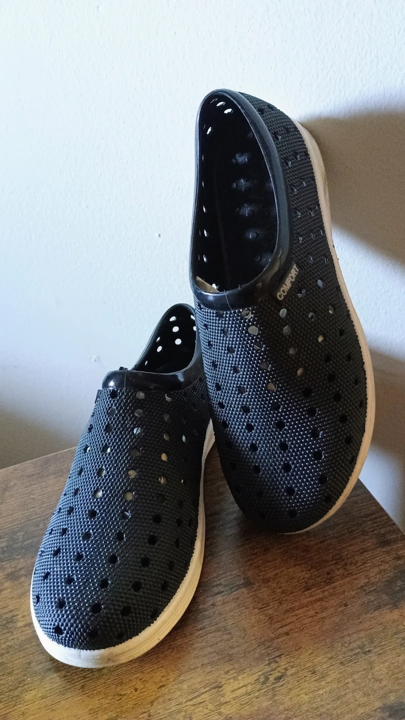 Comfort slip-on water shoes in black. These shoes are made of a flexible, perforated material, perfect for beach or water activities. Easy to clean and quick drying!