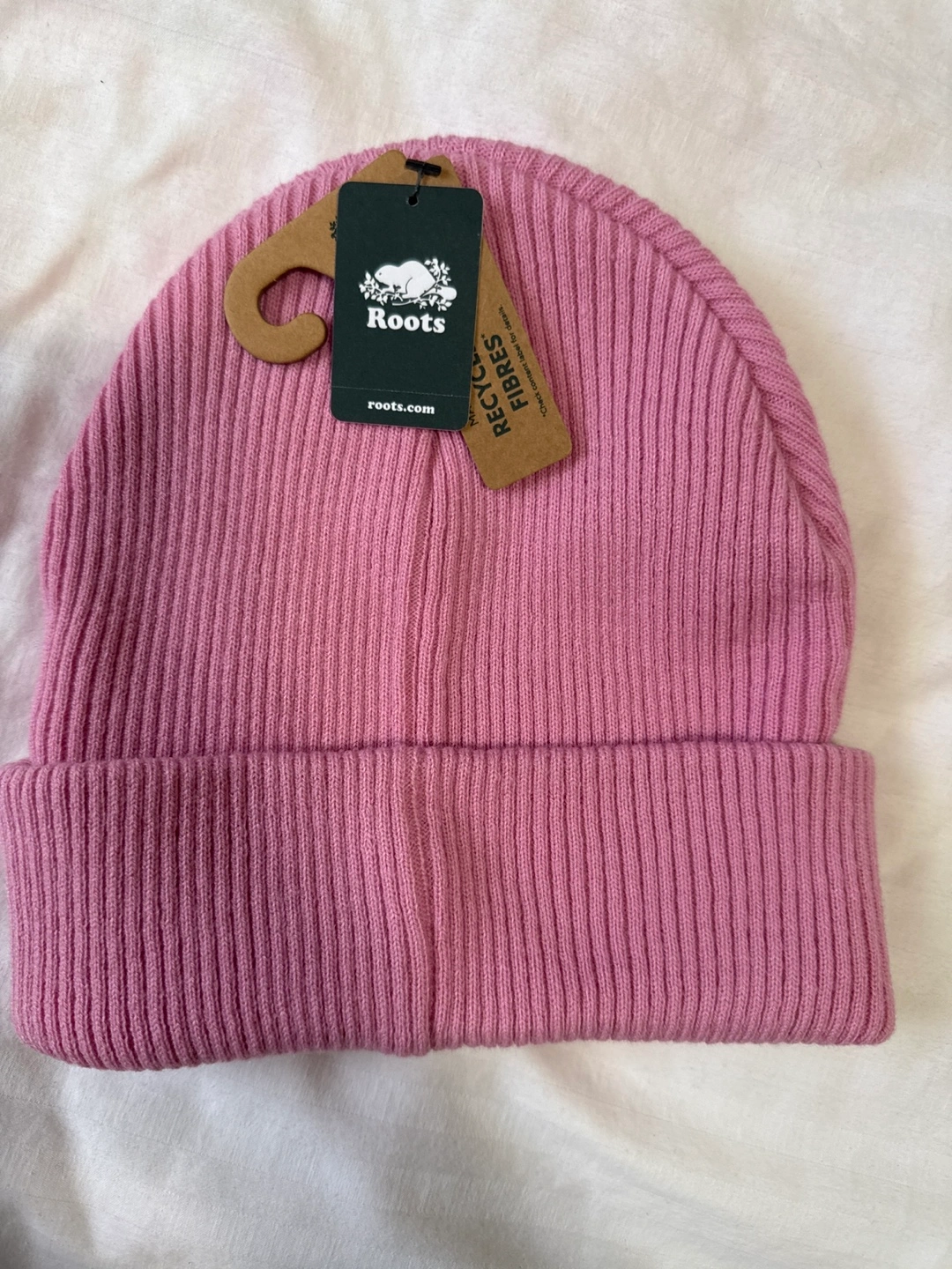 96Pink ribbed beanie with Roots logo. Made with recycled fibres. New with tags.