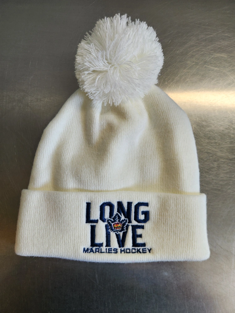 White knit beanie with a pom pom. Features a navy blue embroidered logo with the text "Long Live" and "Marlies Hockey".