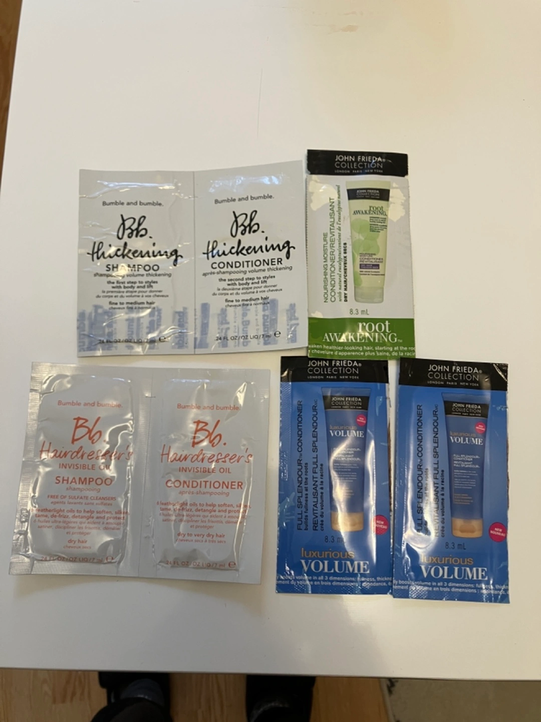 510Assortment of travel/sample size hair products. Includes Bumble and bumble thickening shampoo and conditioner, Bumble and bumble Hairdresser's Invisible Oil shampoo and conditioner, John Frieda Root Awakening conditioner and John Frieda Luxurious Volume shampoo and conditioner.