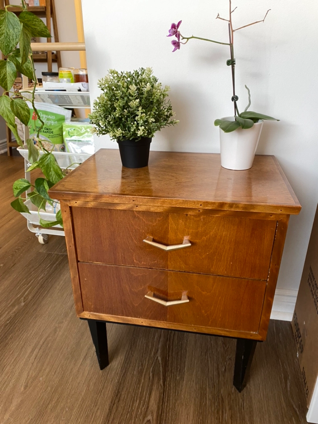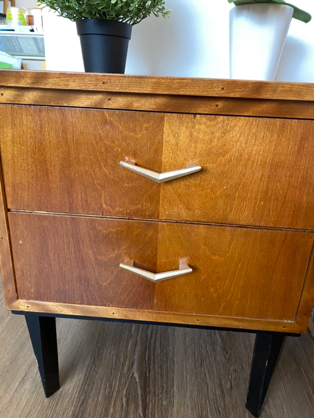 Beautiful wooden nightstand with black legs and metal handles. Good condition with some markings which have been pictured. Originally purchased at an estate sale a few years ago but I moved and sadly it no longer fits in my new space. Needs a new loving home!