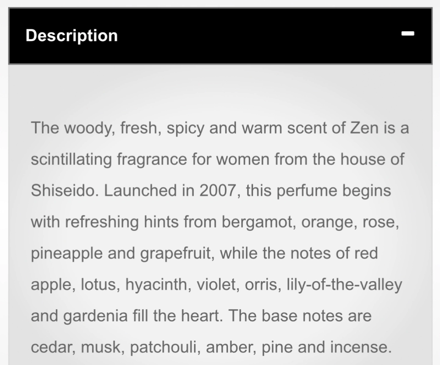 The woody, fresh, spicy and warm scent of Zen is a scintillating fragrance for women from the house of Shiseido. Launched in 2007, this perfume begins with refreshing hints from bergamot, orange, rose, pineapple and grapefruit, while the notes of red apple, lotus, hyacinth, violet, orris, lily-of-the-valley and gardenia fill the heart. The base notes are cedar, musk, patchouli, amber, pine and incense.
