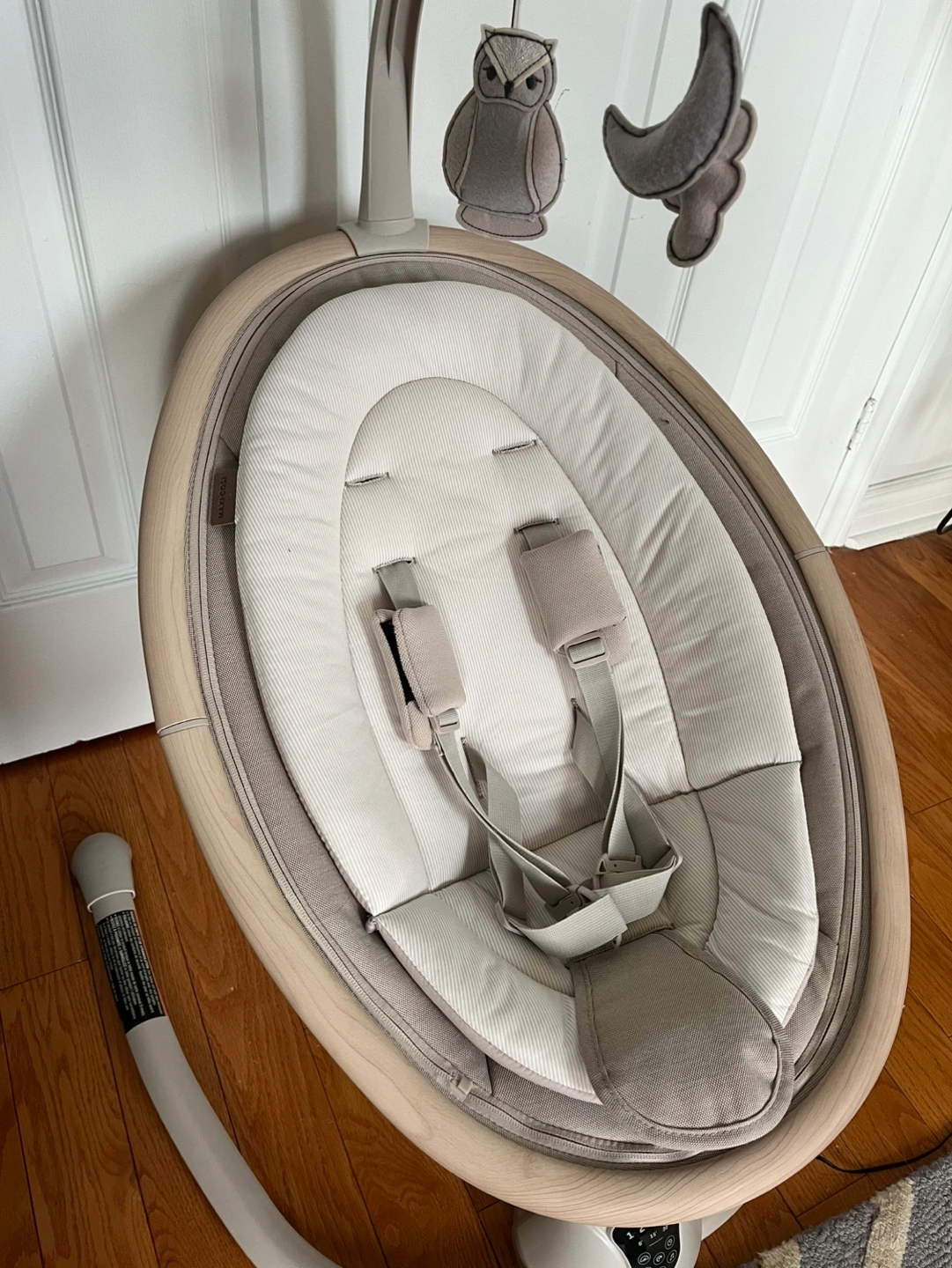 Like-new Maxi-Cosi Cassia Swing. Used only a handful of times. No stains. 5 speeds and 12 melodies, grey fabric seat with wooden trim. Includes mobile with owl and cloud toys. #ThriftyPicks #baby #newborn