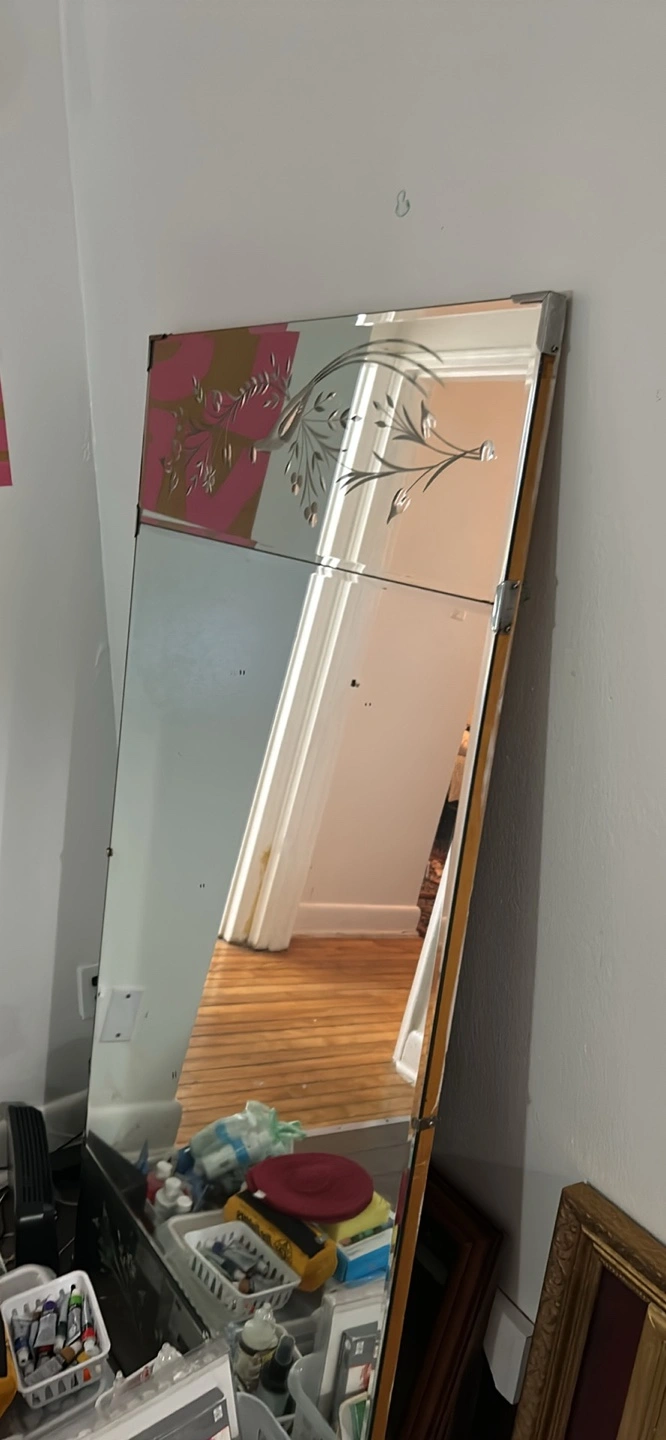 Large vintage etched mirror, with a bird and floral design. 30x60 inches. Foniks design on each sides