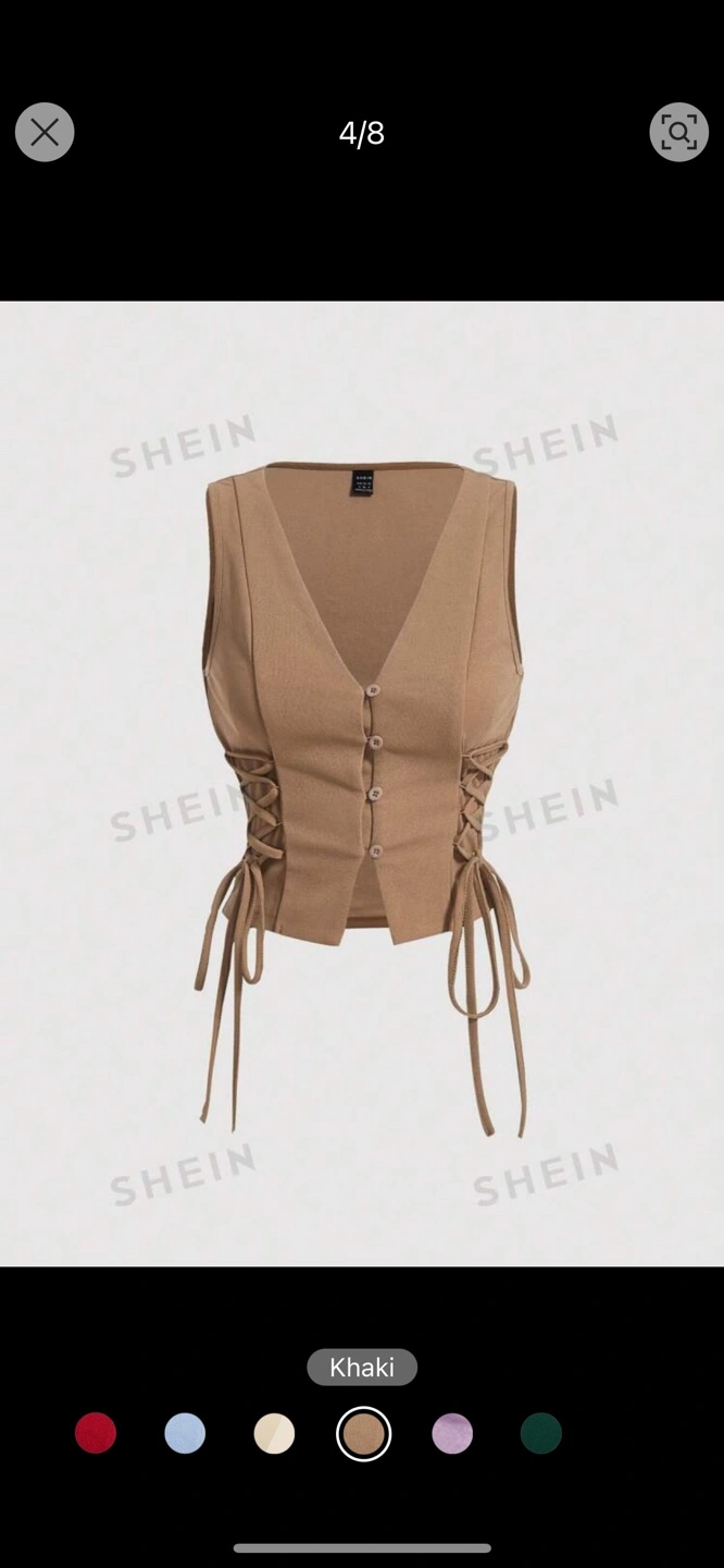 Khaki sleeveless vest with lace-up detailing on the sides and button closure. Size XS-S.