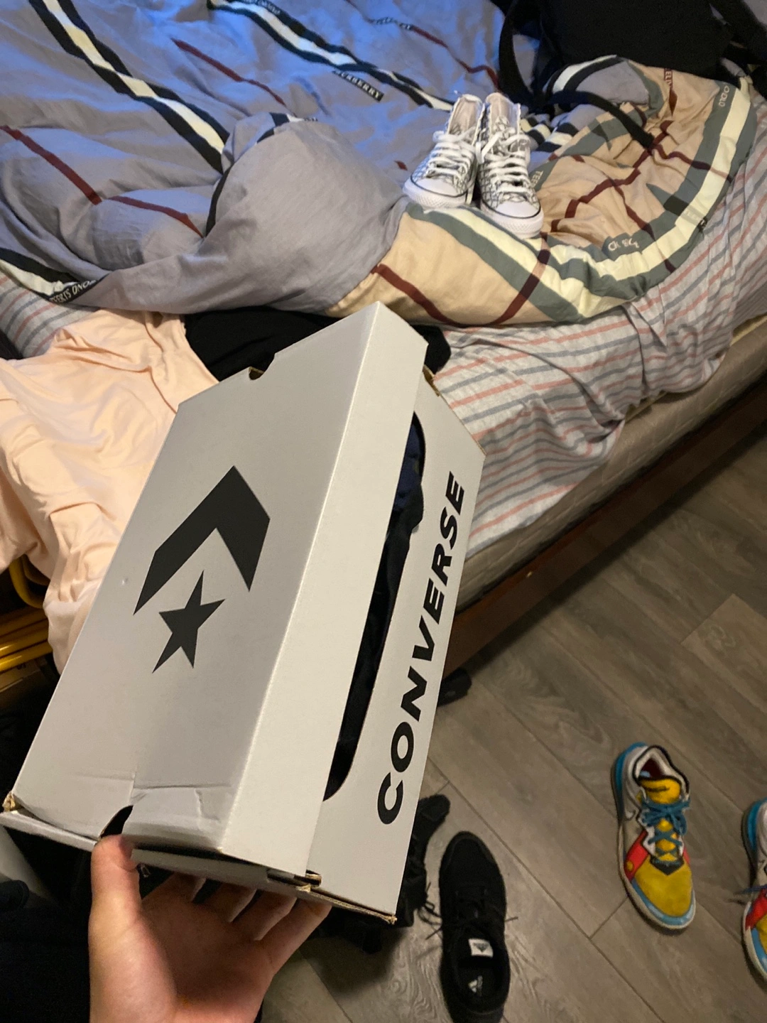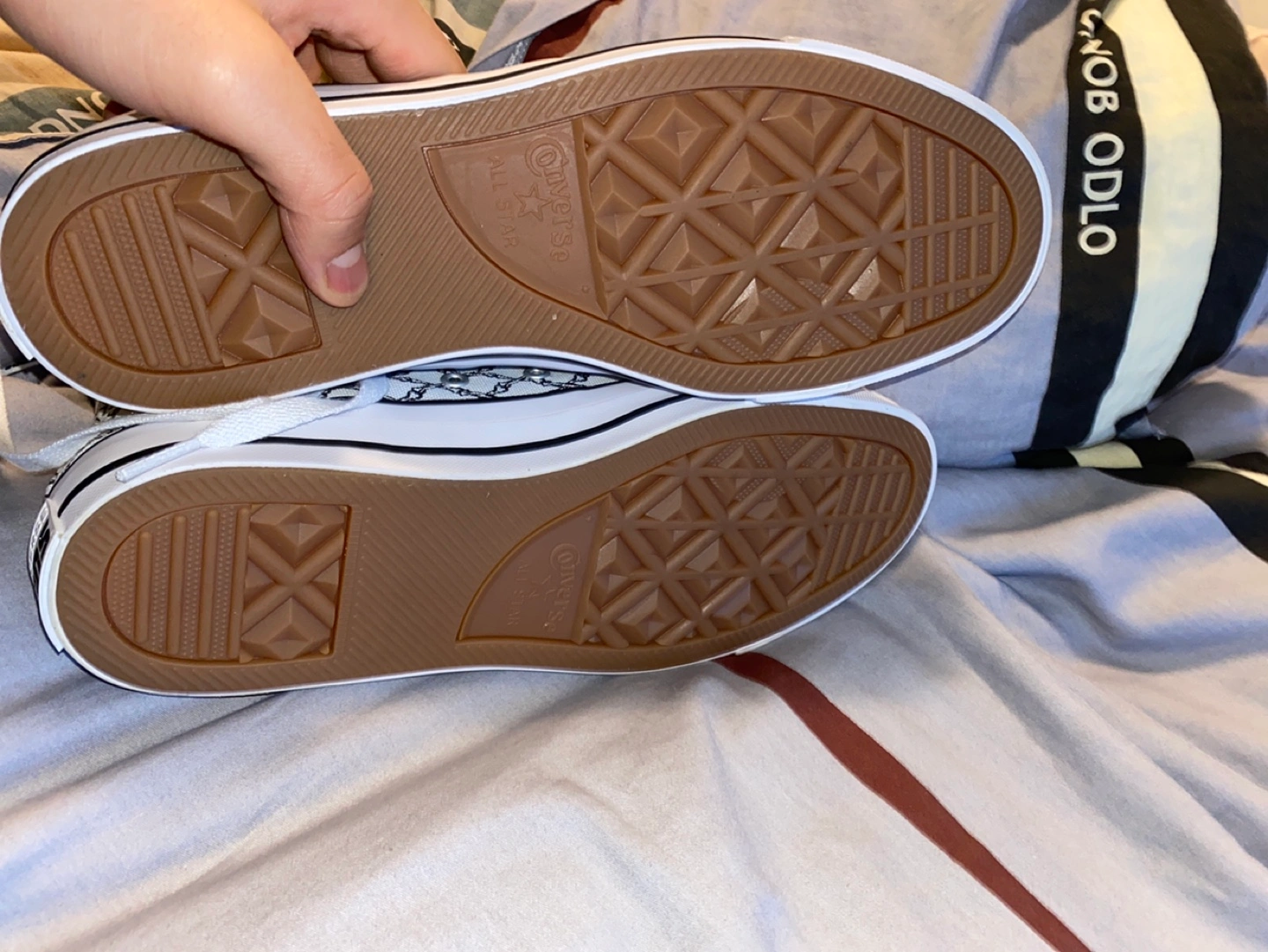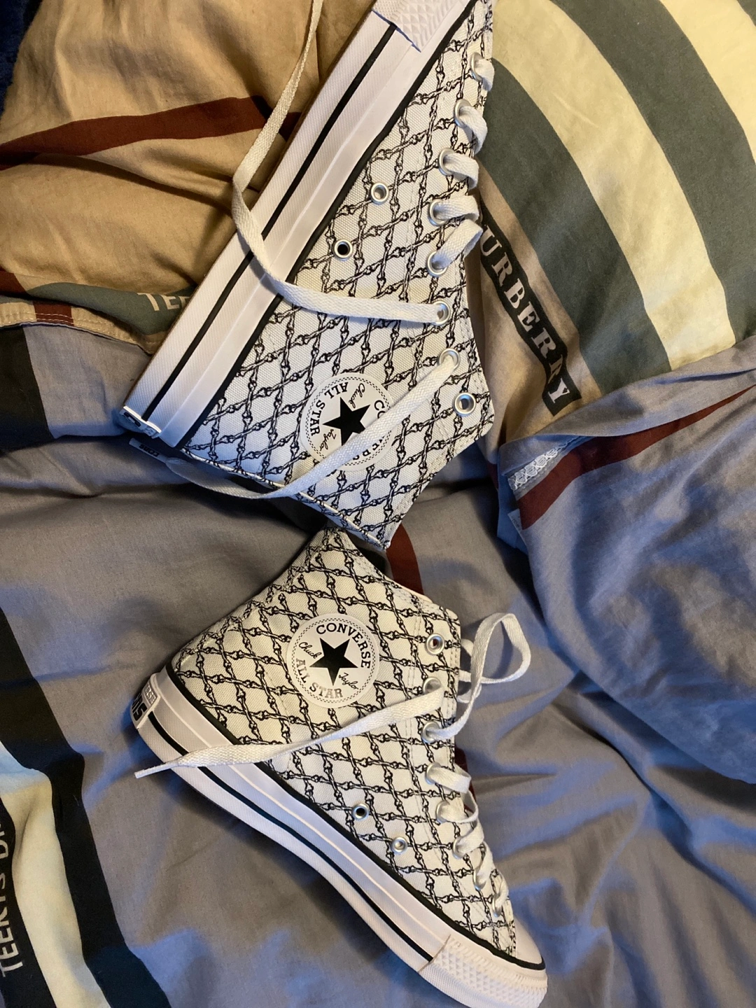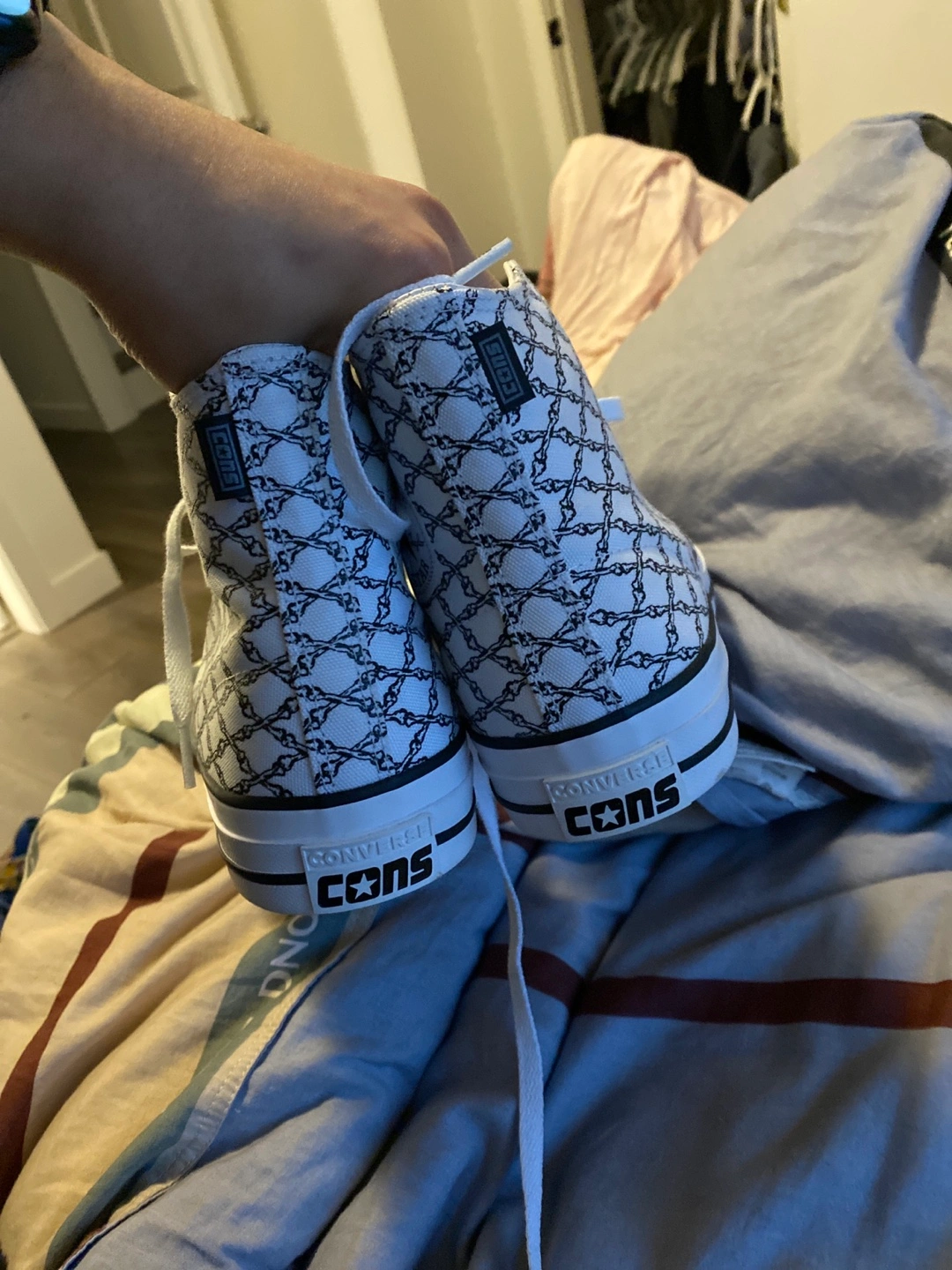 93White high top sneakers with a chain pattern. Comes with original box. Worn but in good condition.