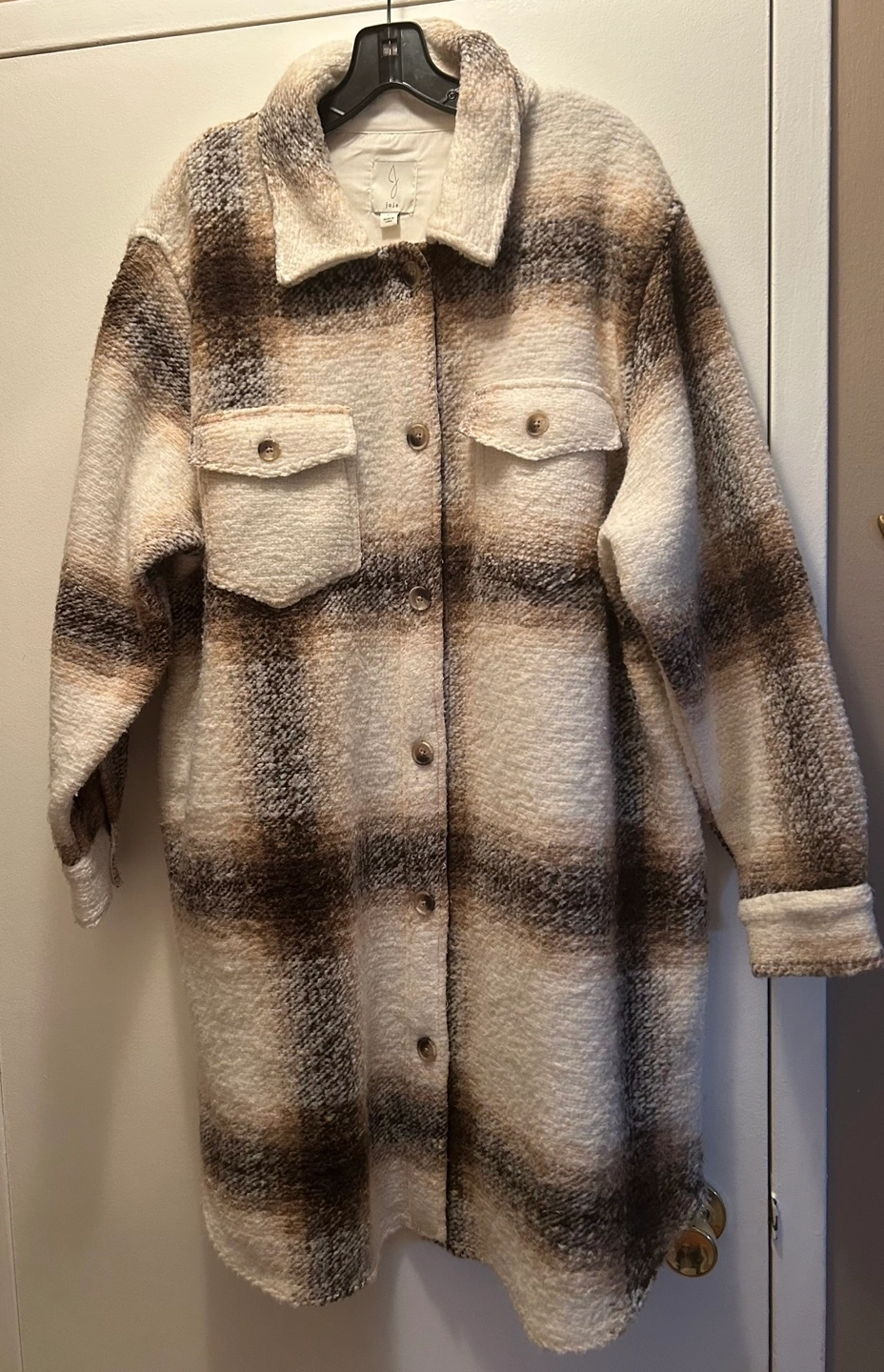 Cozy long sleeve, button-up shirt jacket. Oversized fit. Cream, brown, and beige plaid pattern. Two flap pockets on the chest and two at the sides. Relaxed silhouette.