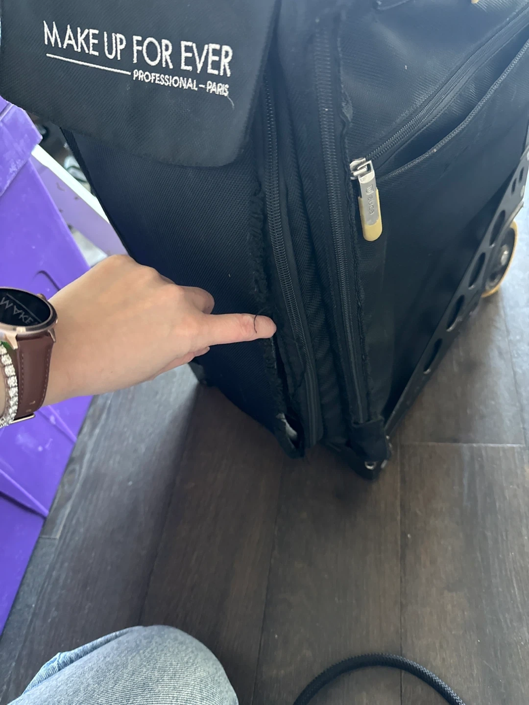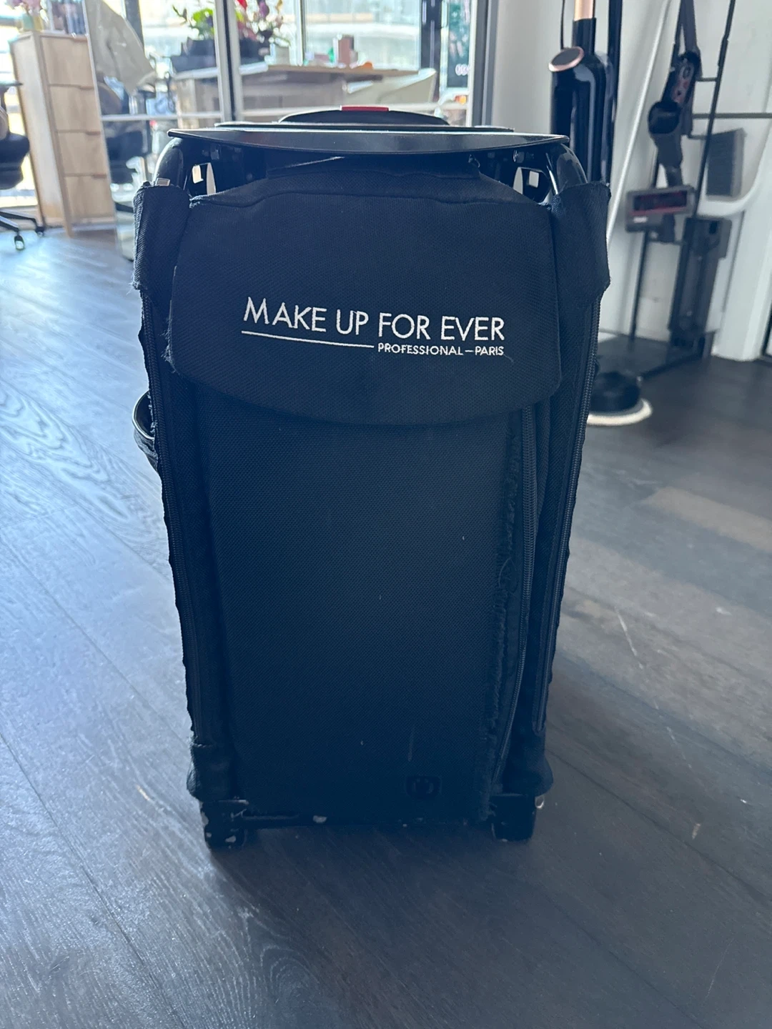 Make Up For Ever Professional rolling makeup case in black. It's designed for organizing and transporting professional makeup. Durable construction with wheels for easy mobility. Front has a rip but can be fixed or you can buy a new bag for the frame online. Everything still works perfectly and nothing will fall out.