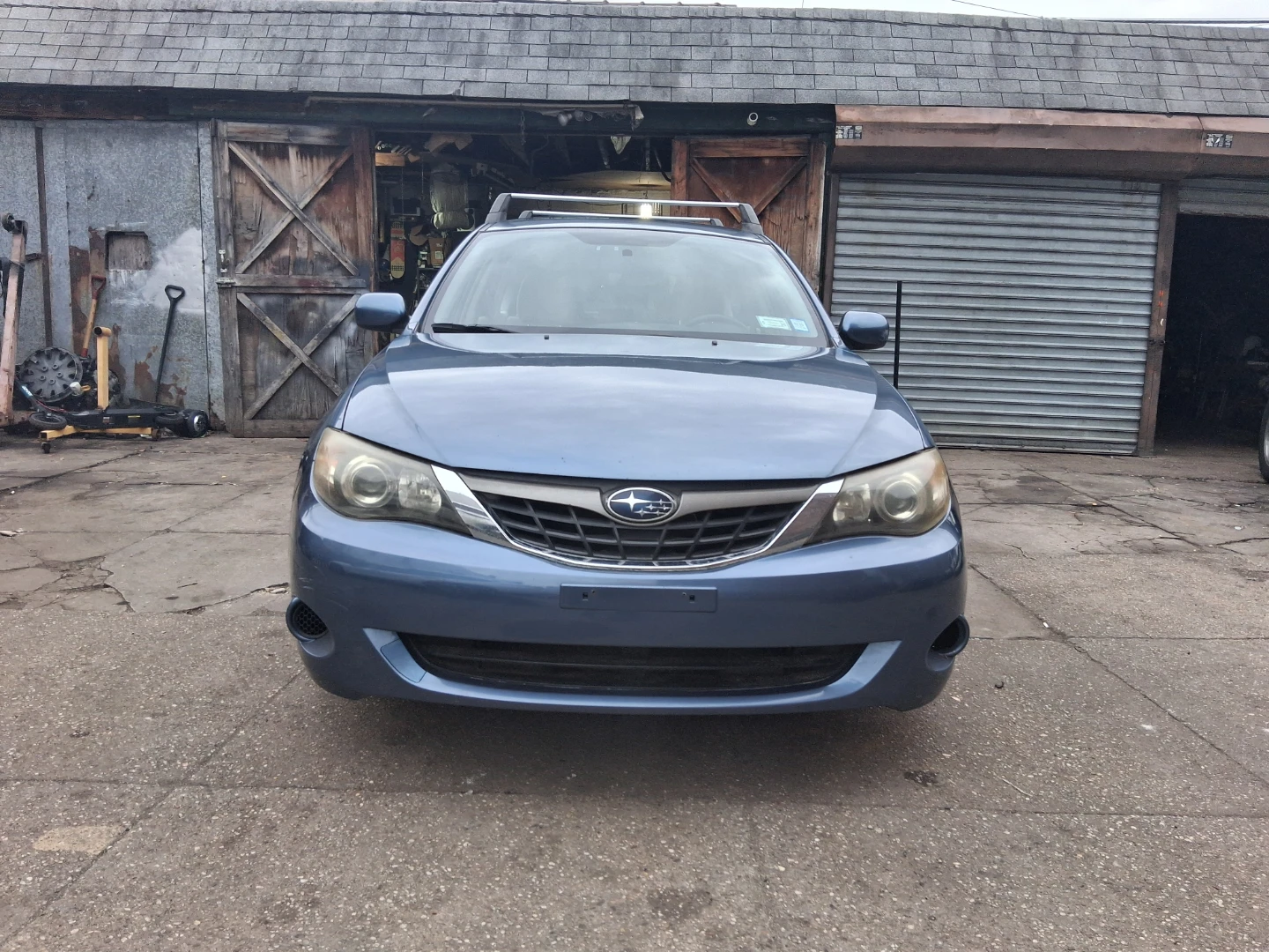 Blue 2008 Subaru Impreza 2.5i wagon with roof racks. Interior features cloth seats and an automatic transmission. All-wheel drive.