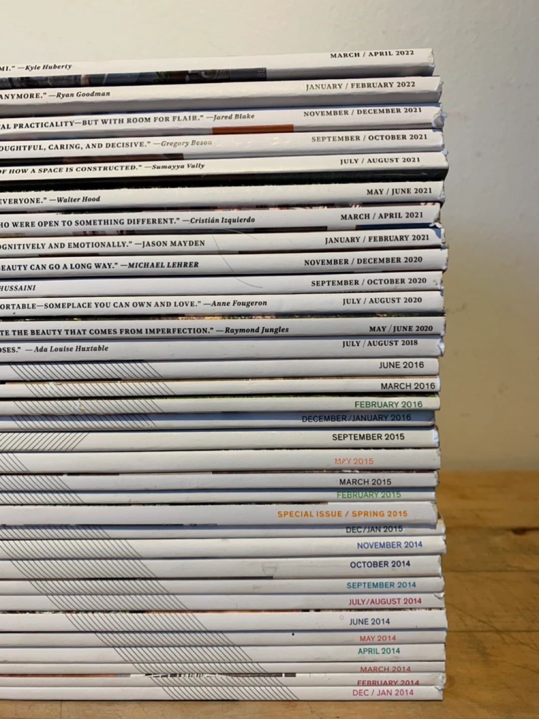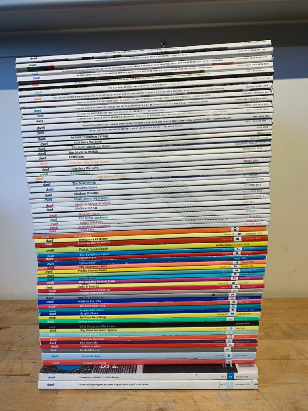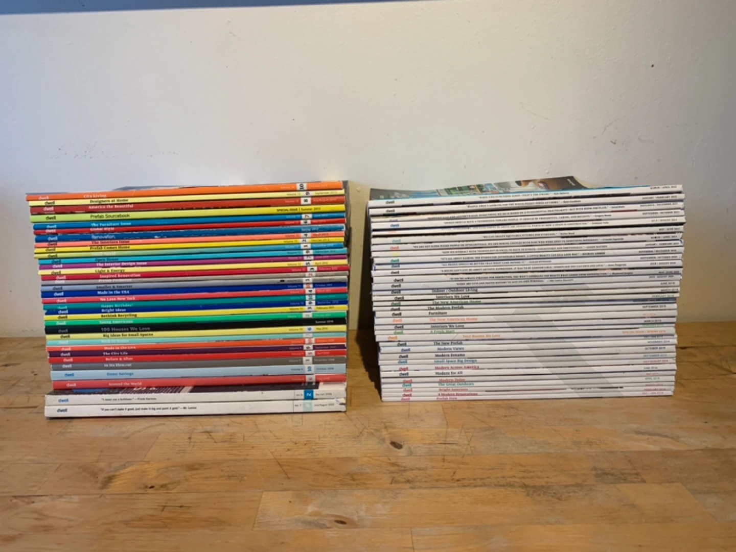 Lot of 67 DWELL Magazines including a few Special editions. Starting in August 2007 to April 2022. Near pristine condition. Mostly read once each during train travels. Selling as a lot of 67. I was gonna recycle them into little stools like on the last photo but decided to let them go instead. No delivery. Front door pickup in Roncesvalles. Price is firm. They were $6.99 each when I started buying them in 2007 to $11.99 when I stopped a year ago. I will not respond to lowballers