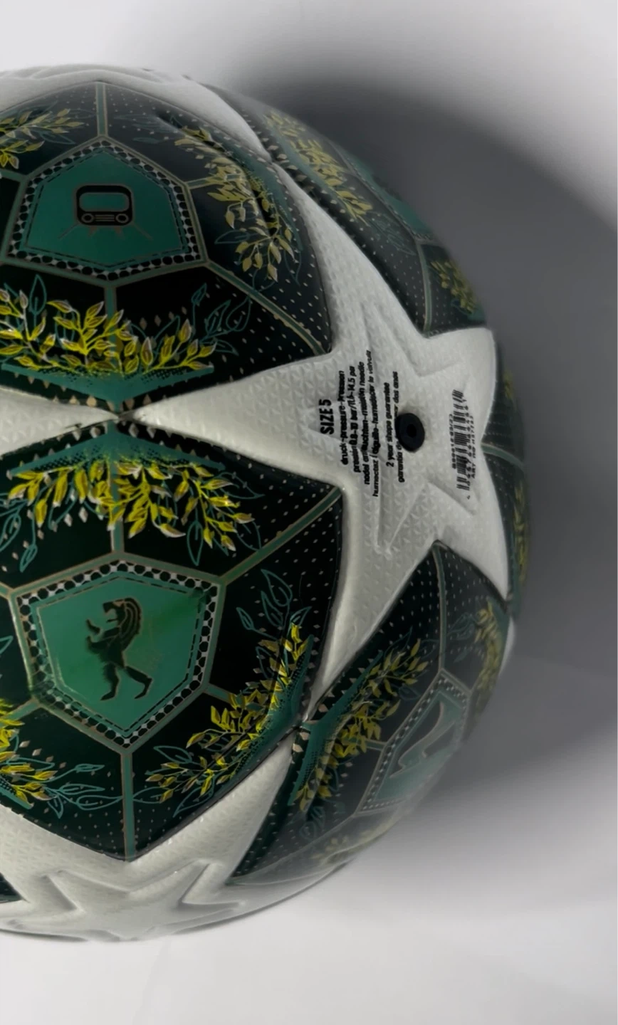 This is an Adidas Finale 25 soccer ball for the Munich 2025 Champions League final. It's size 5. It has a thermally bonded surface for better touch and lower water absorption.