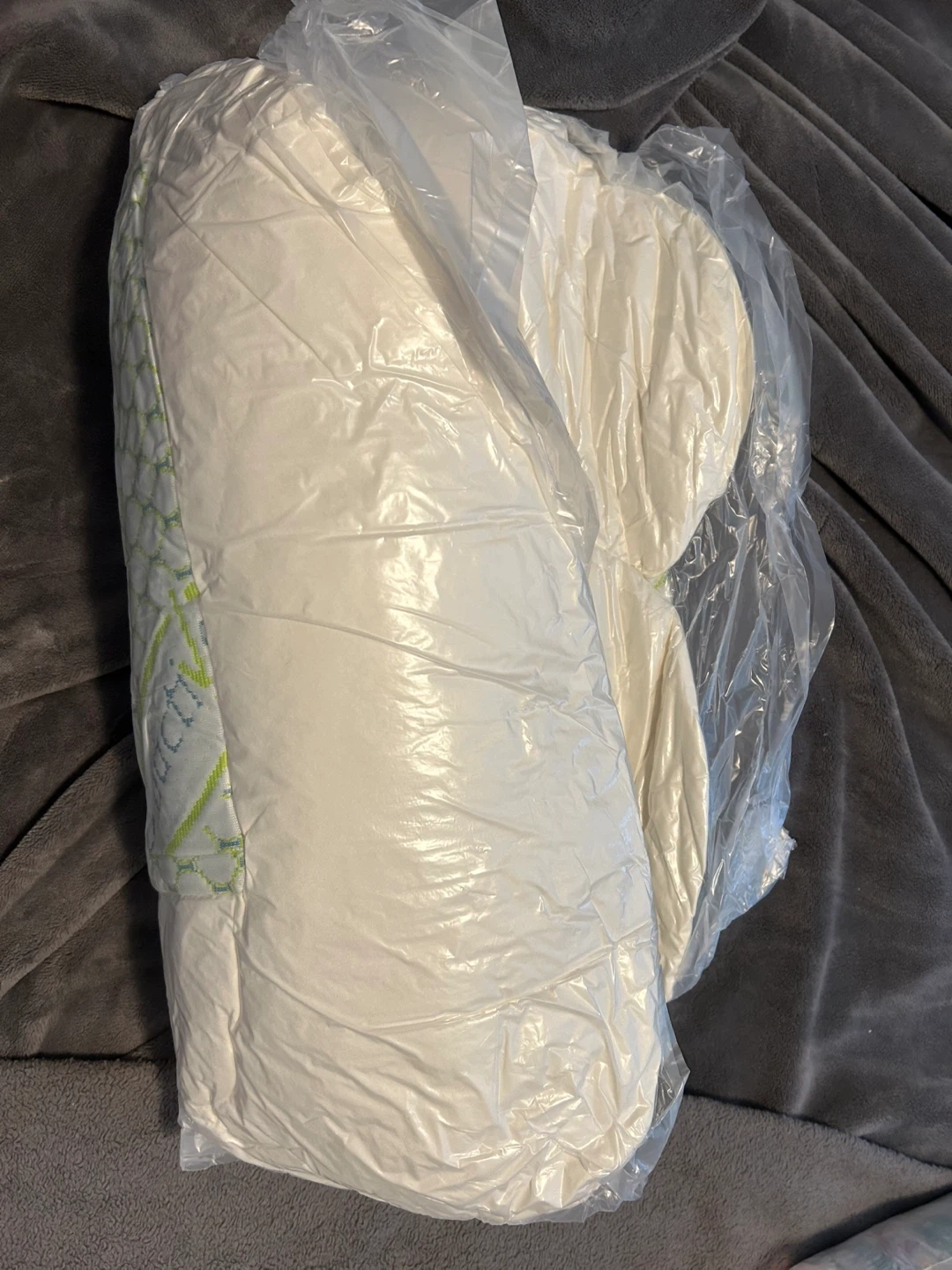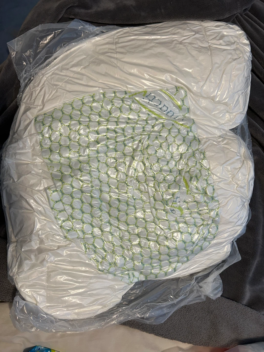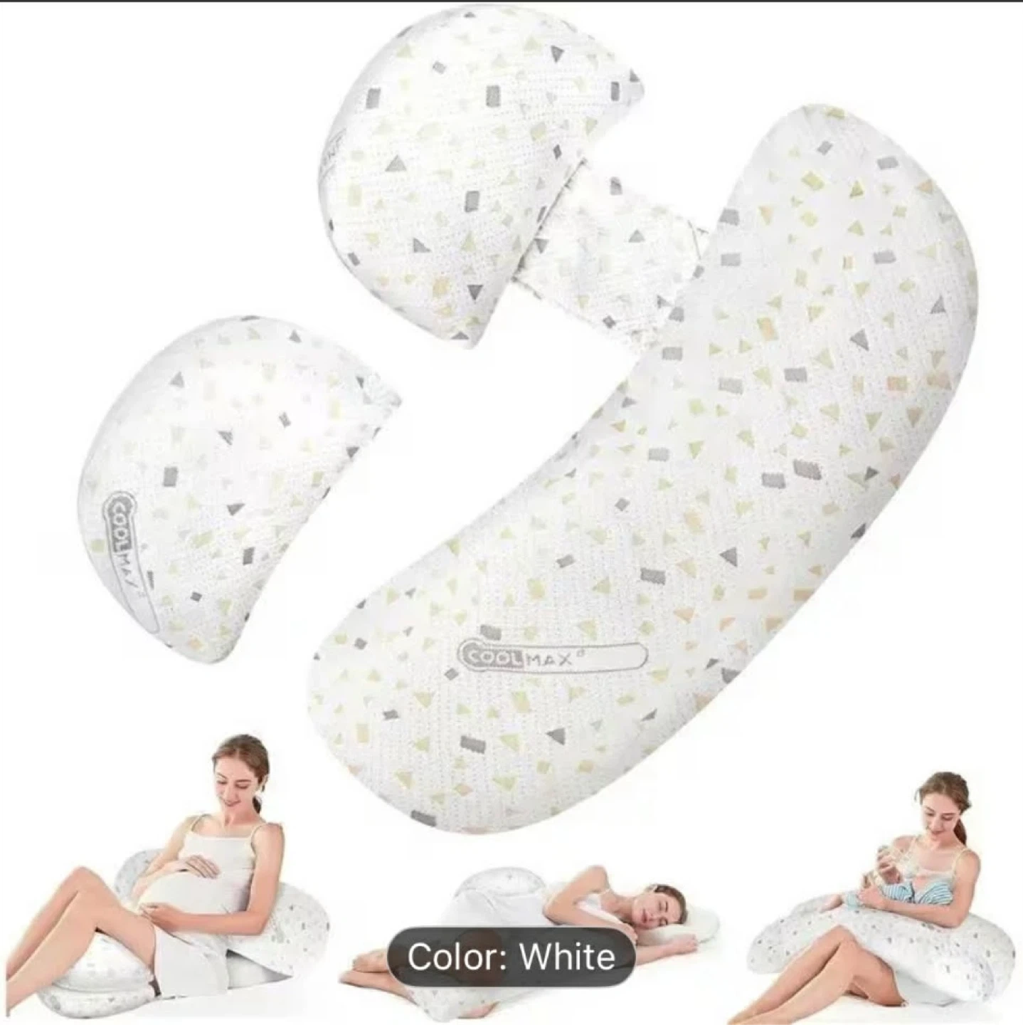 This C-shaped pregnancy pillow is designed for comfort and support. It features a white cover with a subtle geometric pattern and comes in its original packaging. The pillow is made with CoolMax technology to help regulate temperature.