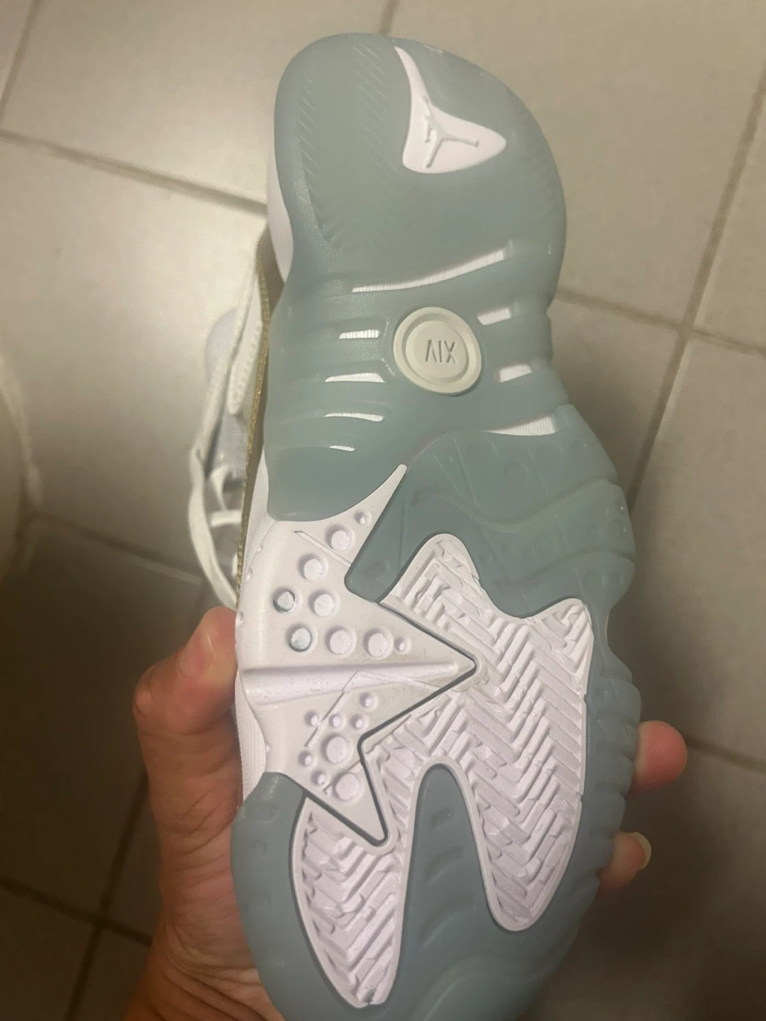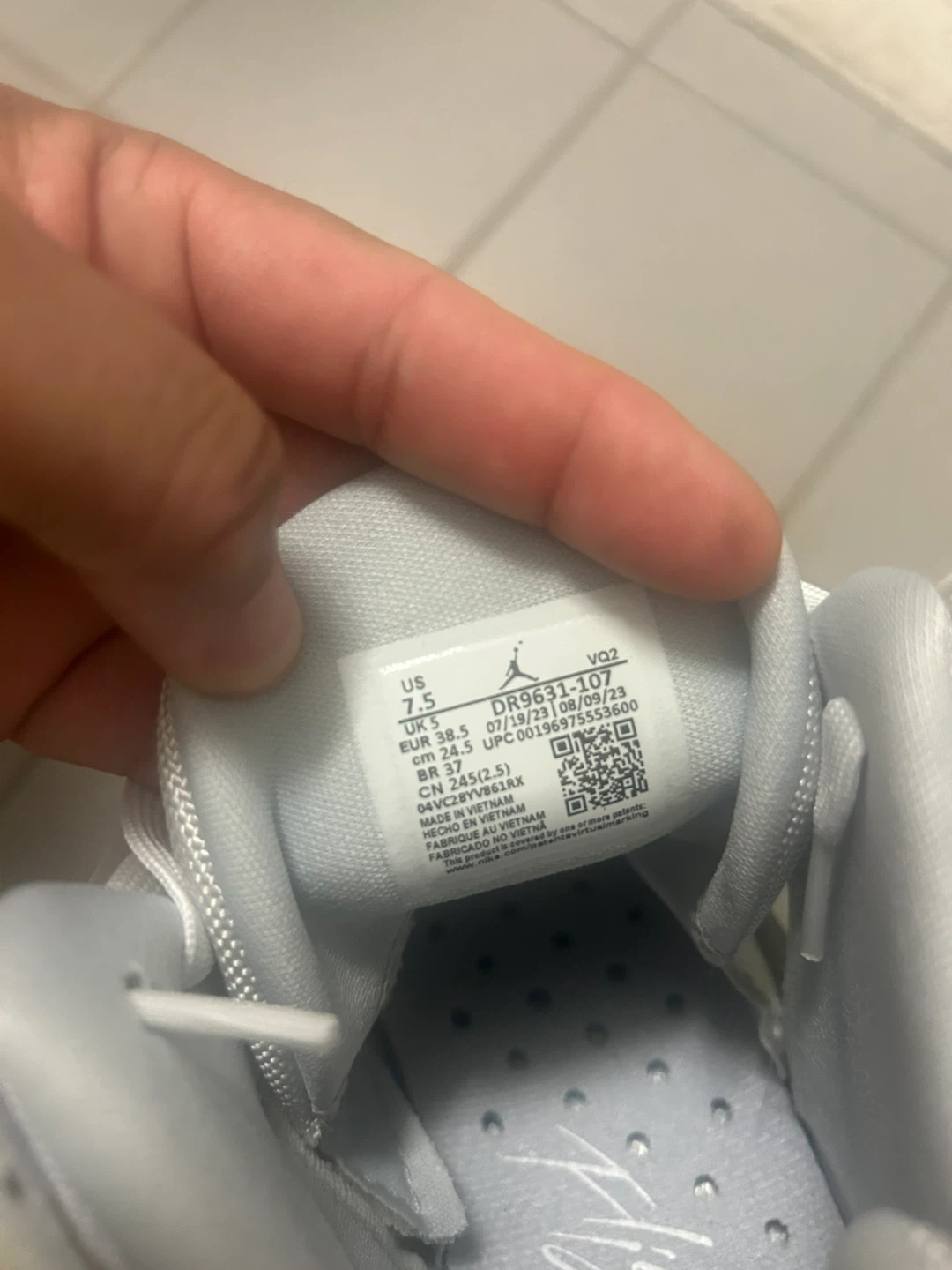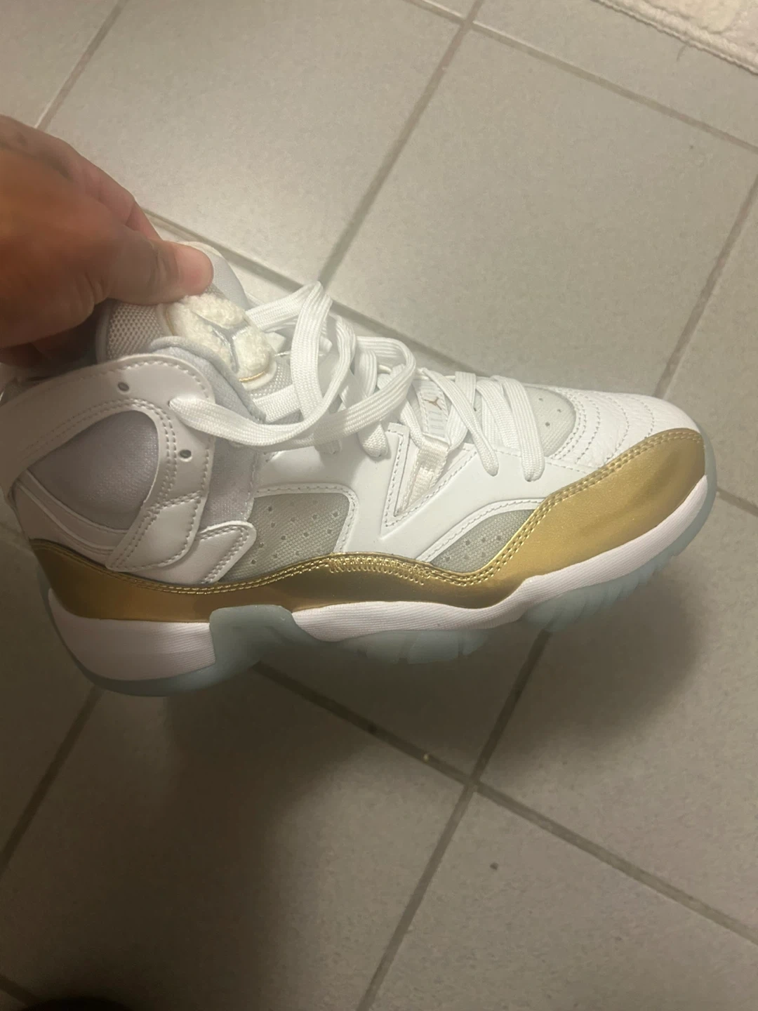 White and gold Air Jordan 11 CMFT Low sneakers. Us size 7.5, UK size 5, EU size 38.5. These kicks are comfy! It don’t not come with no box I moved and the box mash up
