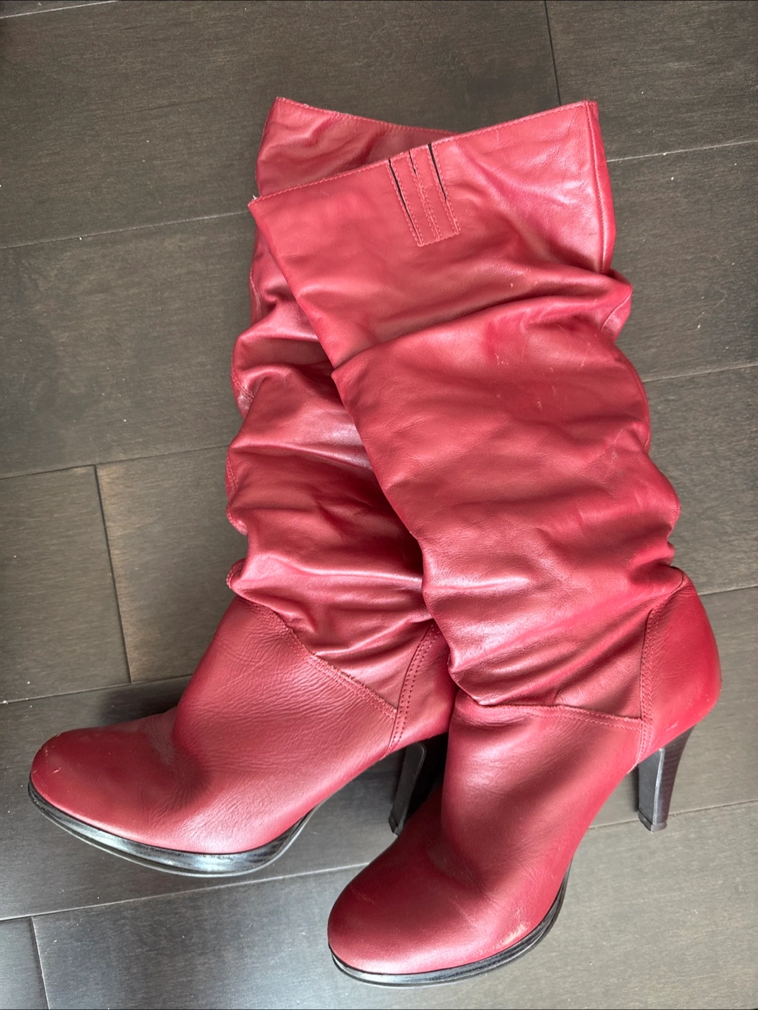Selling a pair of burgundy leather slouch boots. They're in good condition, with a stylish, relaxed look. Perfect for adding a pop of colour to your wardrobe! Real leather size 38 made in Brazil.