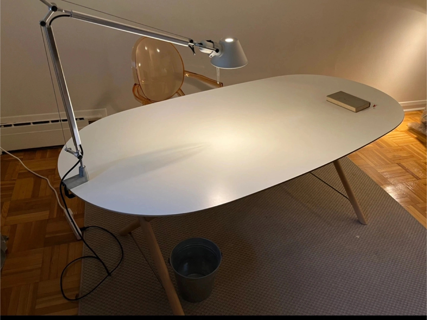 Modern oval-shaped table. White laminate top and light coloured wooden legs.