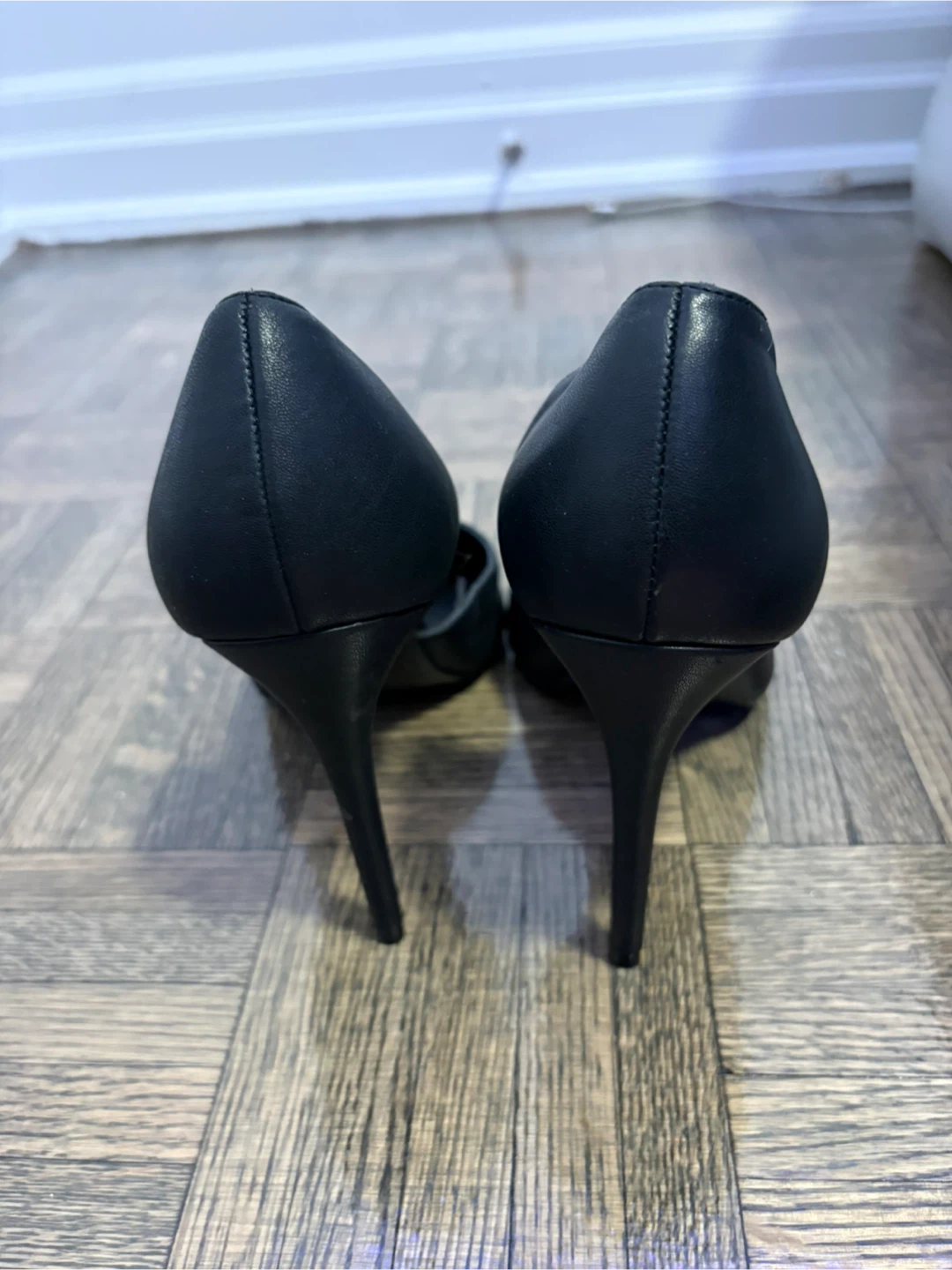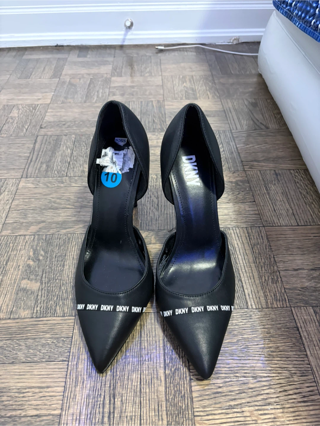 Stylish DKNY black pumps, size 10. These heels feature a classic pointed toe with the brand's logo tape detail around the vamp. They're a versatile choice for dressing up or down.