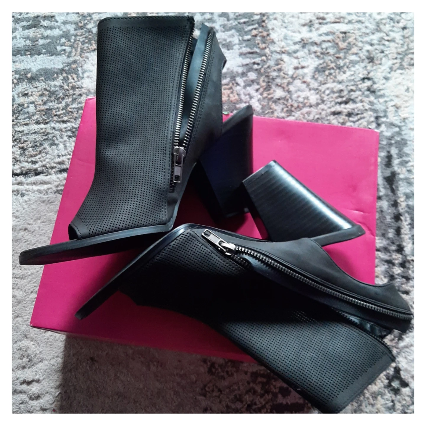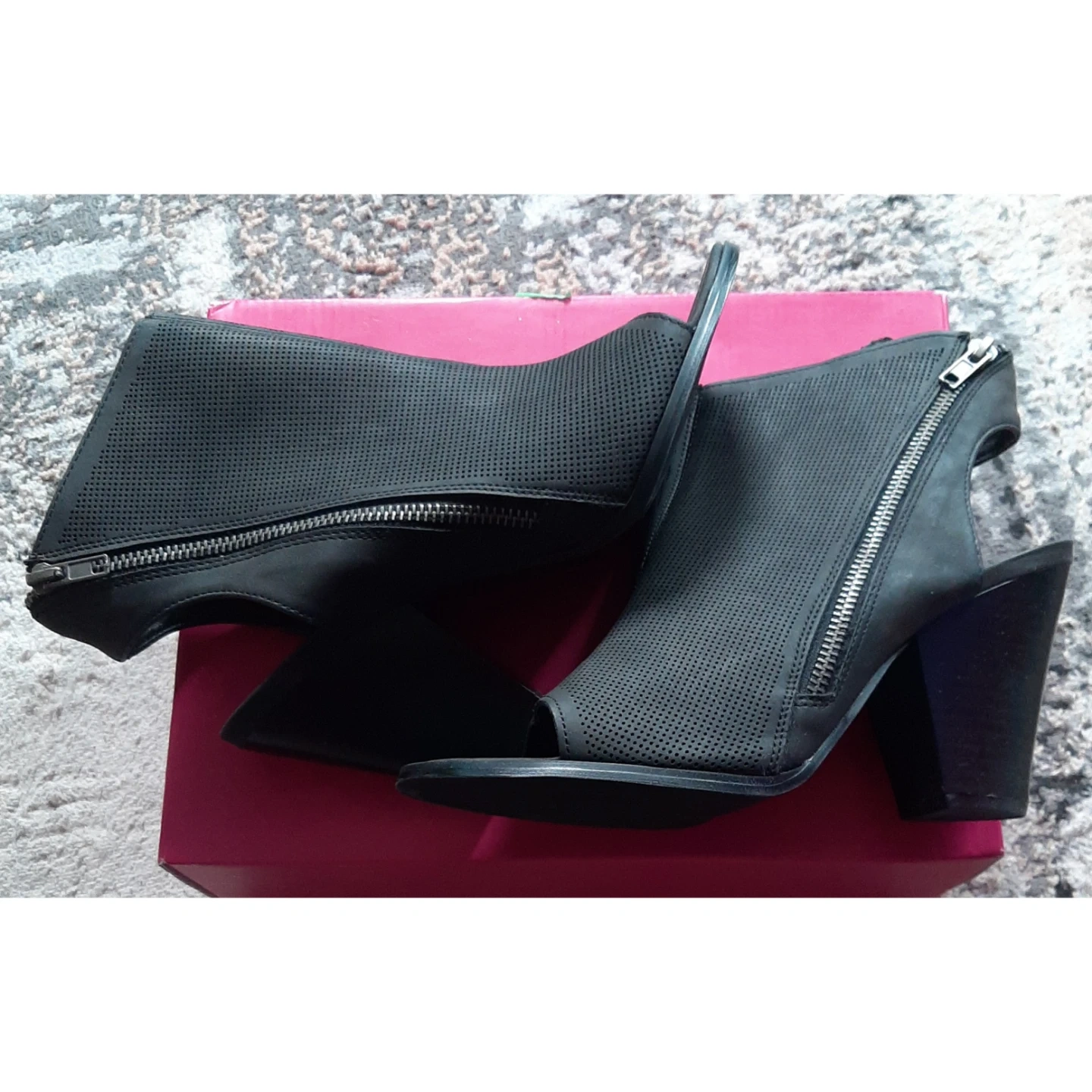 Black perforated peep-toe booties by ShoeDazzle. Features a side zipper and a chunky heel. These stylish booties are made of faux leather. They're great for adding a bit of edge to any outfit!