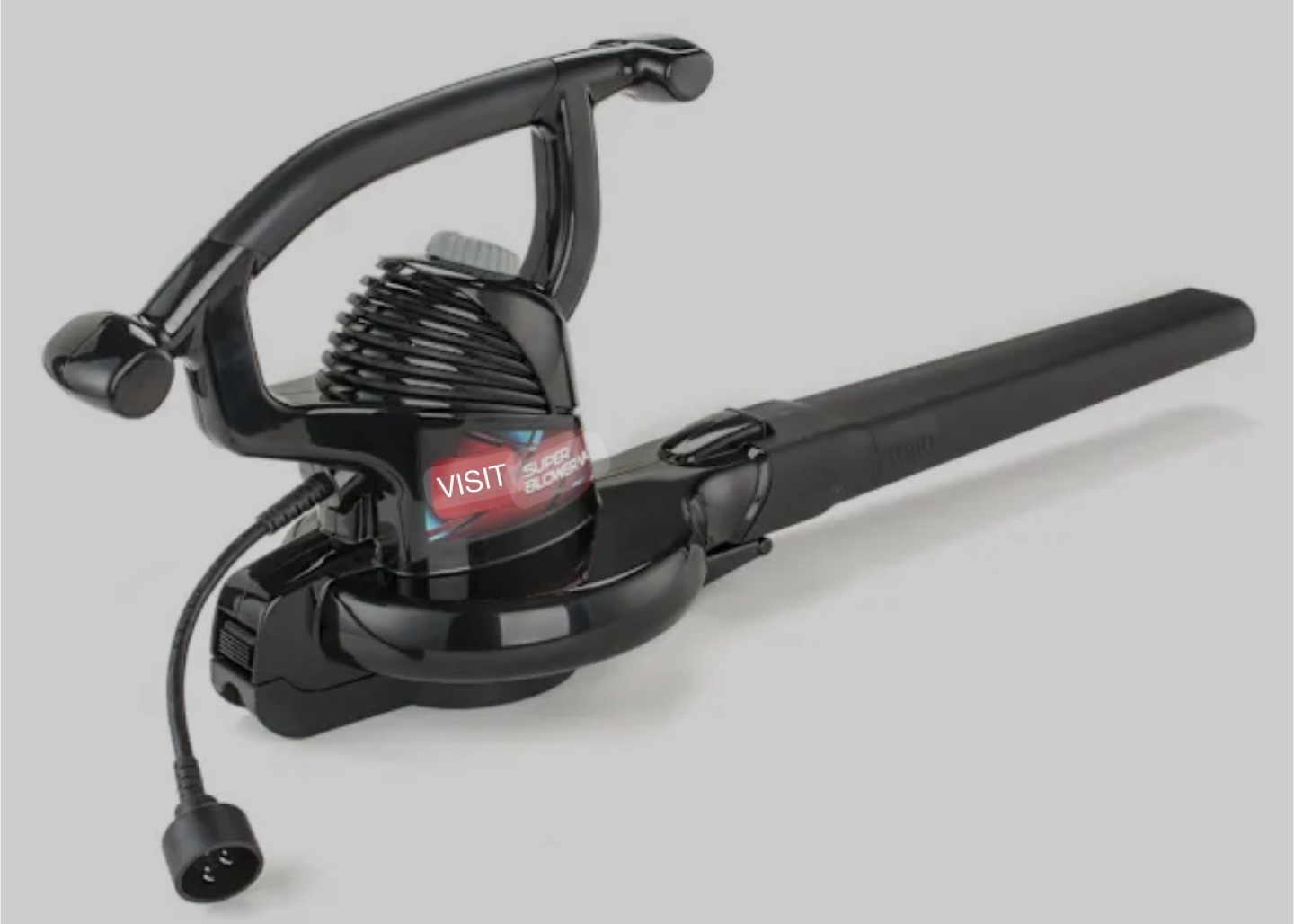An electric leaf blower, in black. Features a long nozzle and a handle for easy grip. The cord is attached for direct power. It would be great to use on those crisp fall days when the leaves begin to fall.