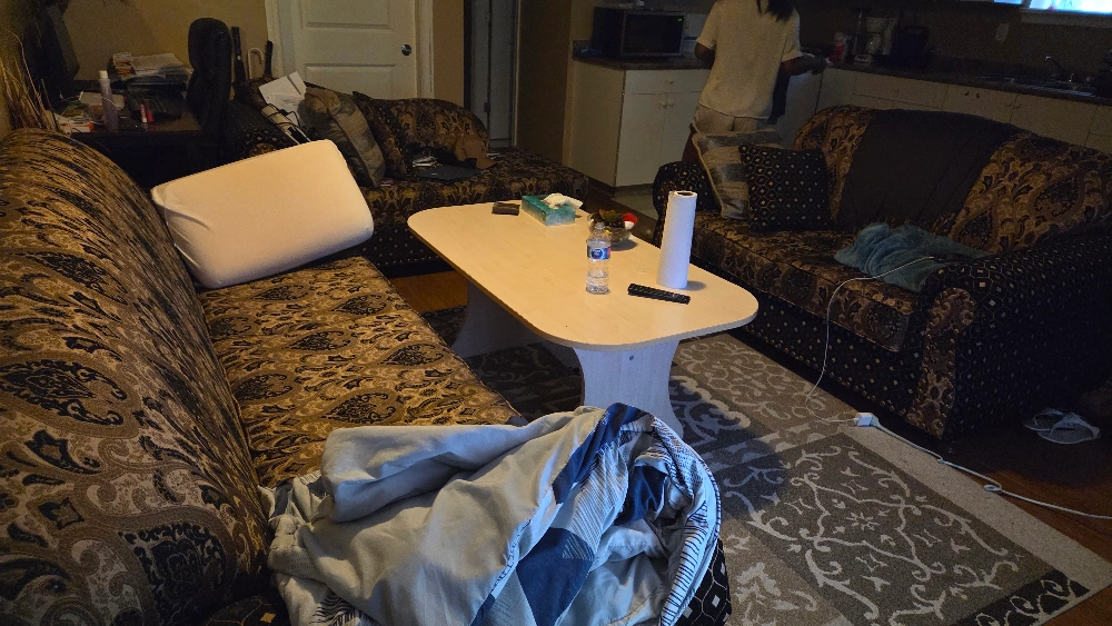 Selling a sofa and loveseat set with a unique patterned design. The set includes decorative pillows as shown in the pictures. Perfect for a living room or den!