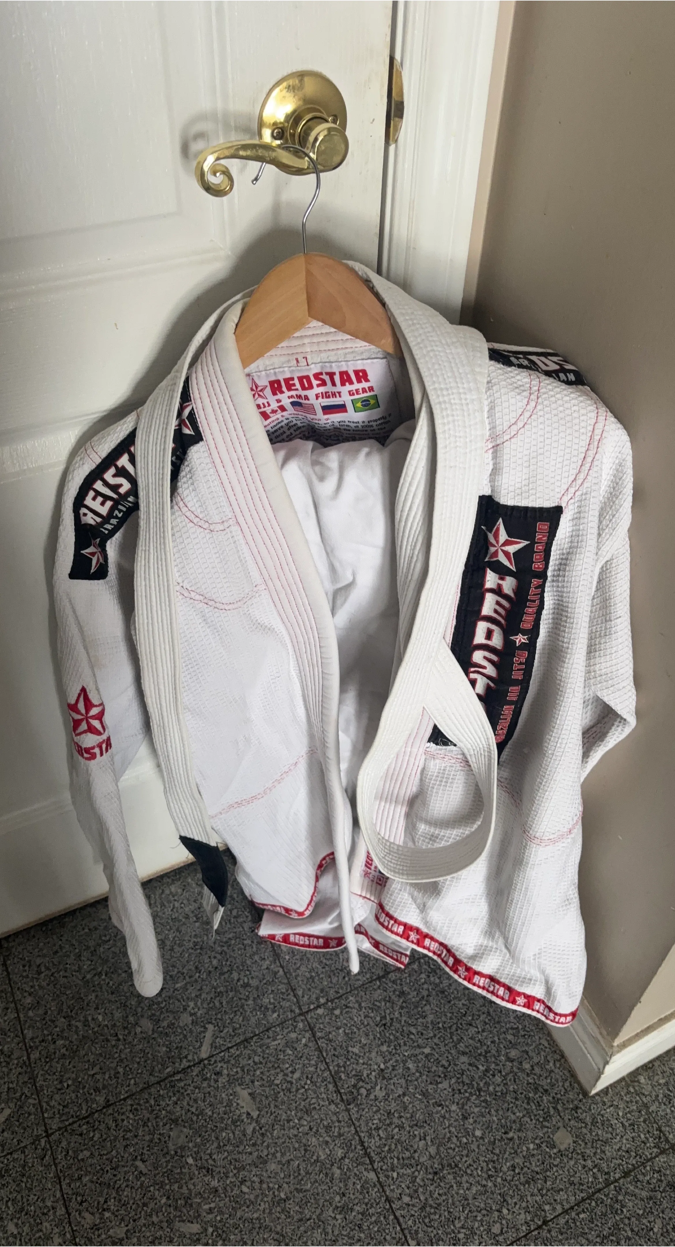 This is a Redstar Brazilian Jiu Jitsu Gi and belt. It's white with red stitching and features multiple brand patches. Includes a white belt. Ready for training!