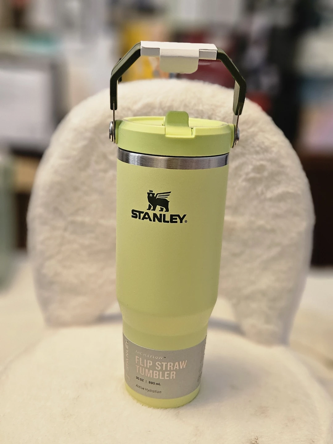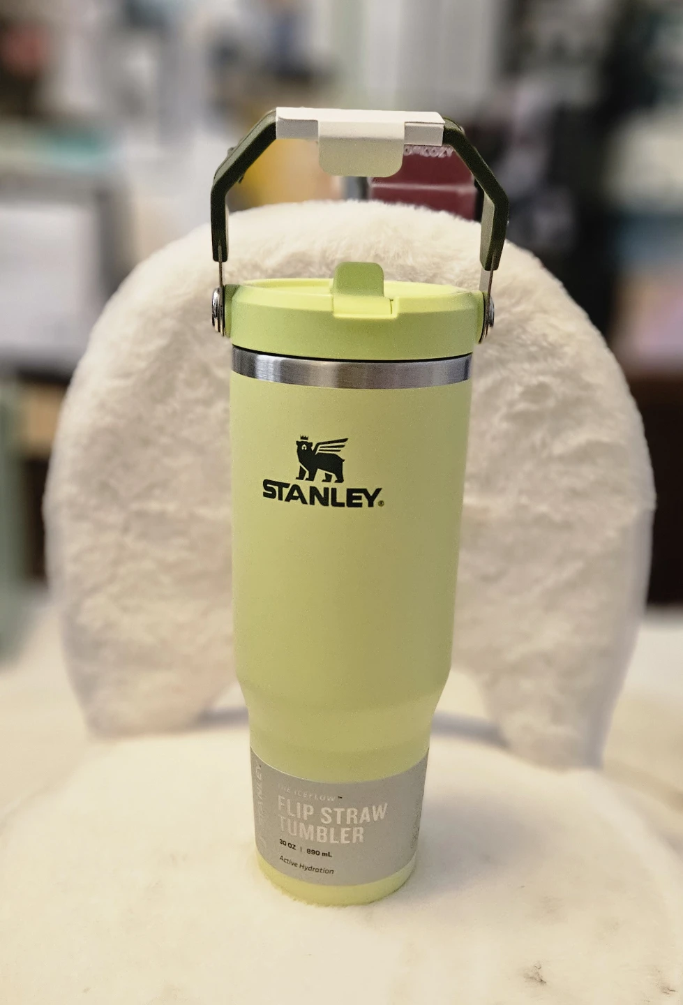 This is a Stanley Flip Straw Tumbler in a pale yellow colour. It's 32 oz (950 ml) and features a flip straw for easy drinking. It's great for active hydration throughout the day!