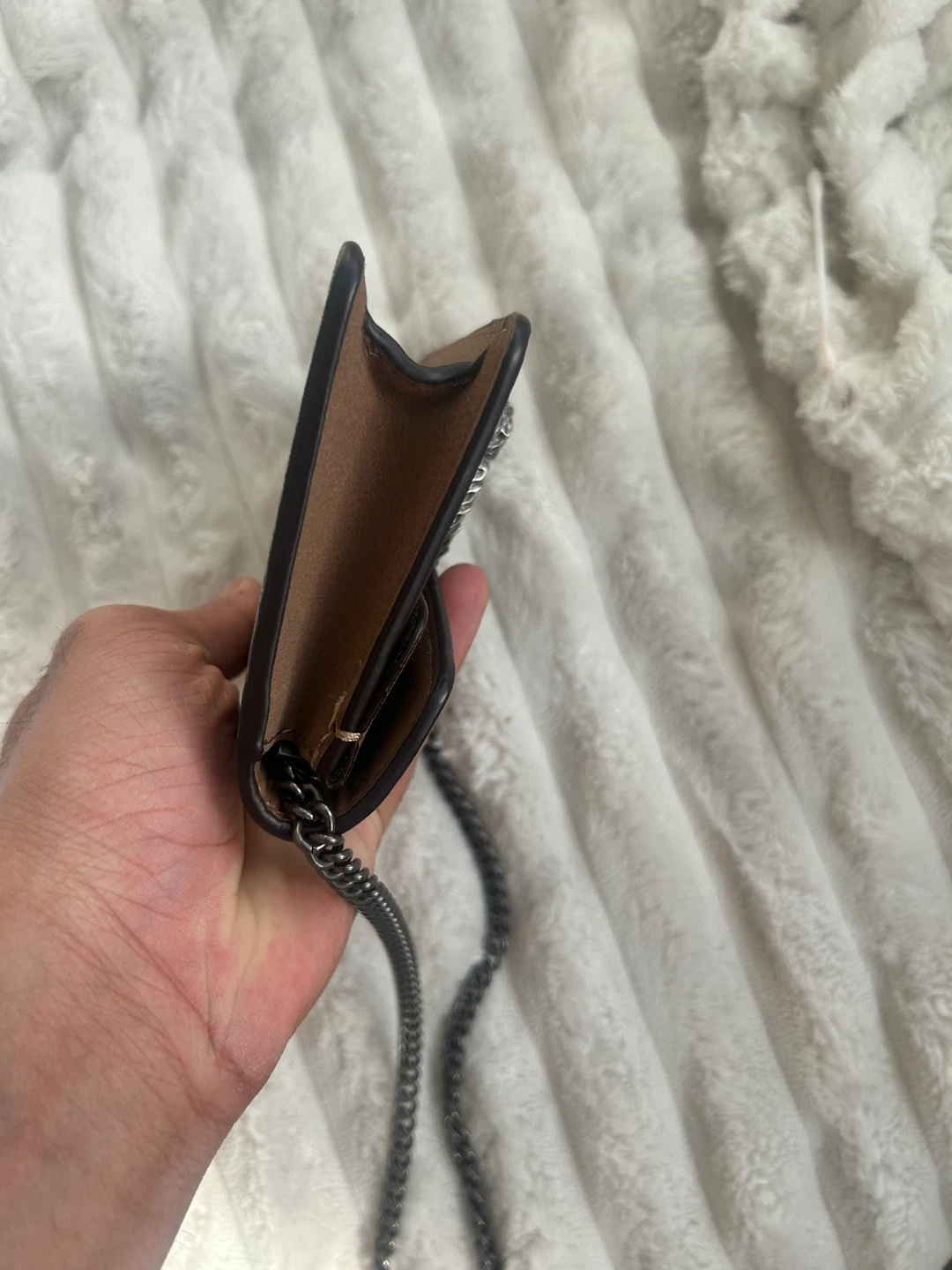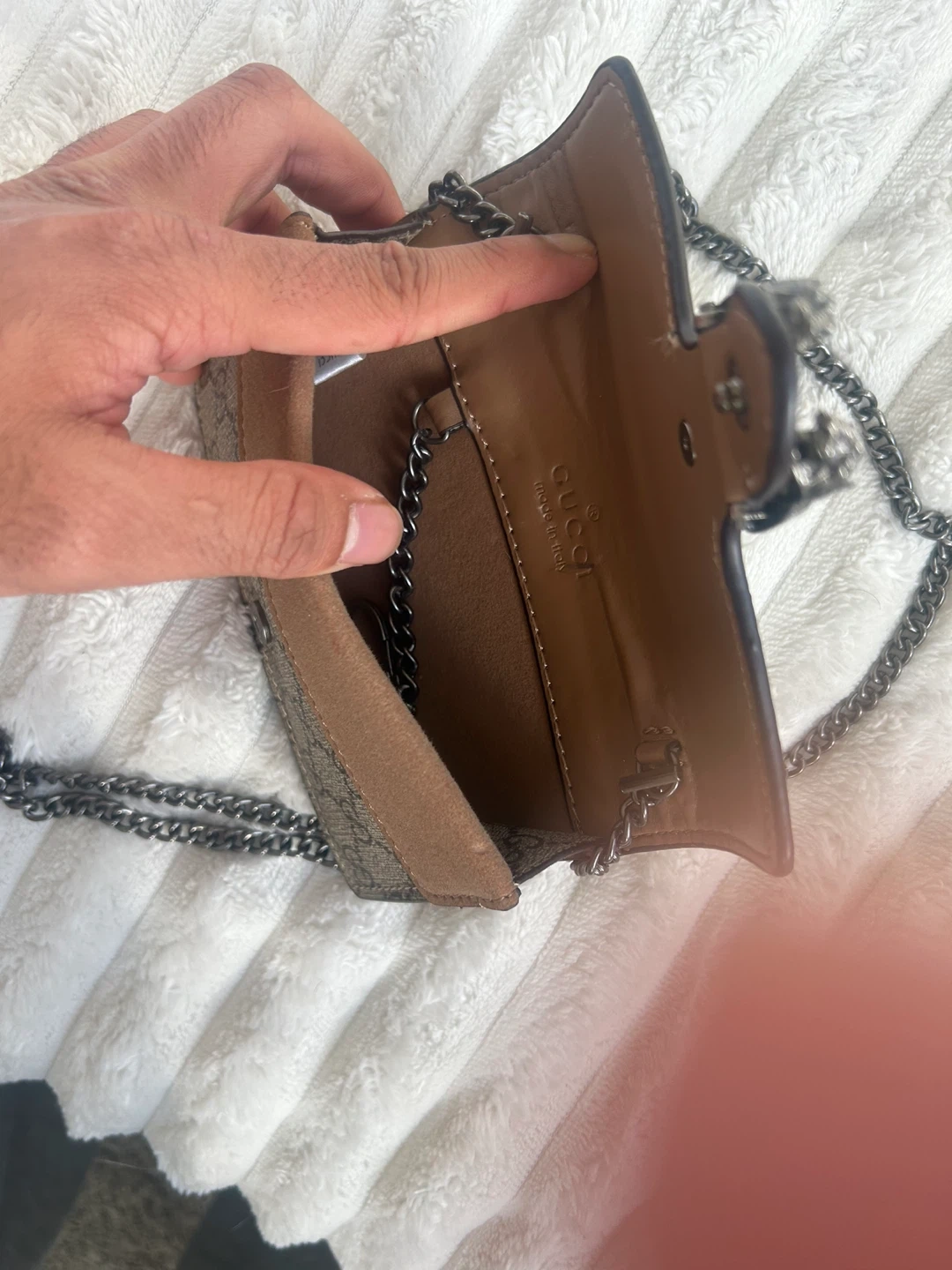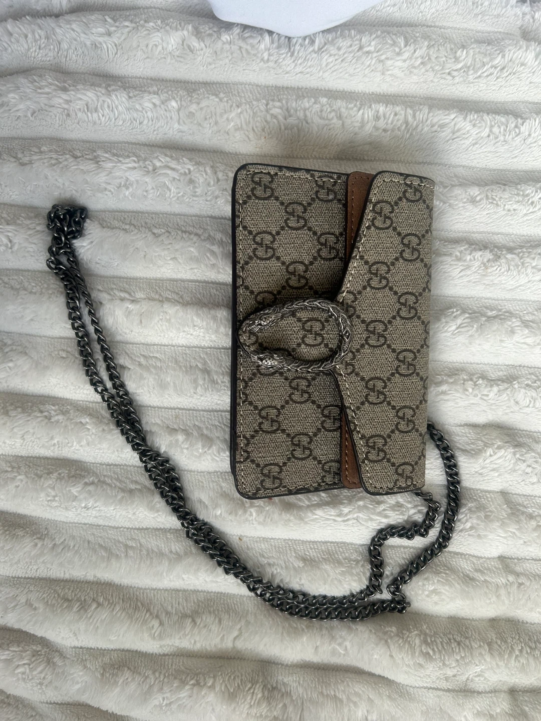 This is a Gucci Dionysus Super Mini Bag in GG Supreme canvas. It features a tiger head spur closure and a chain strap. It's a stylish accessory for your essentials.