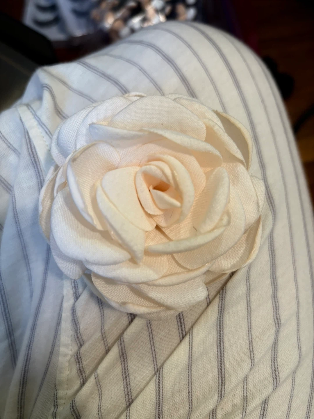 Beautiful ivory fabric camellia flower accessory. Features a metal clip on the back for secure attachment. This versatile piece can be worn as a brooch or a hair clip!