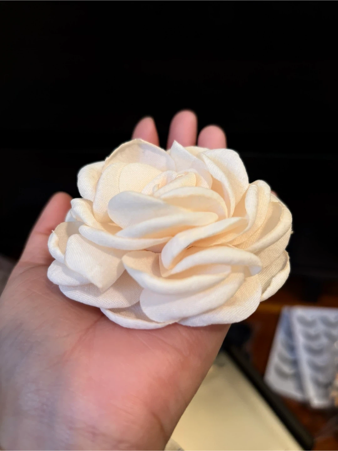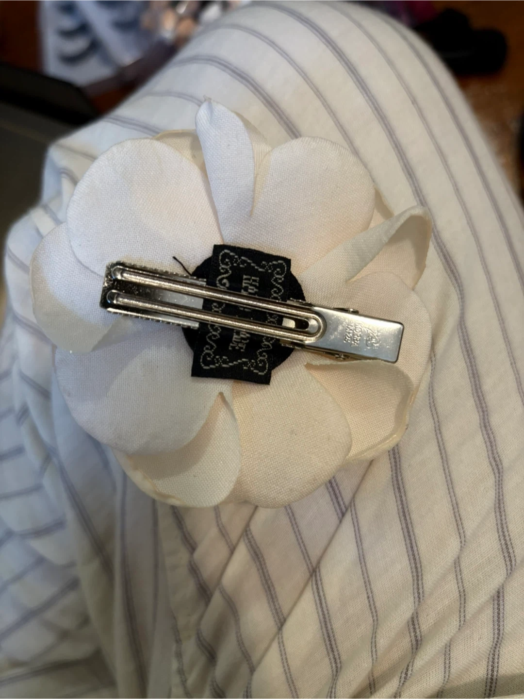 Beautiful ivory fabric camellia flower accessory. Features a metal clip on the back for secure attachment. This versatile piece can be worn as a brooch or a hair clip!