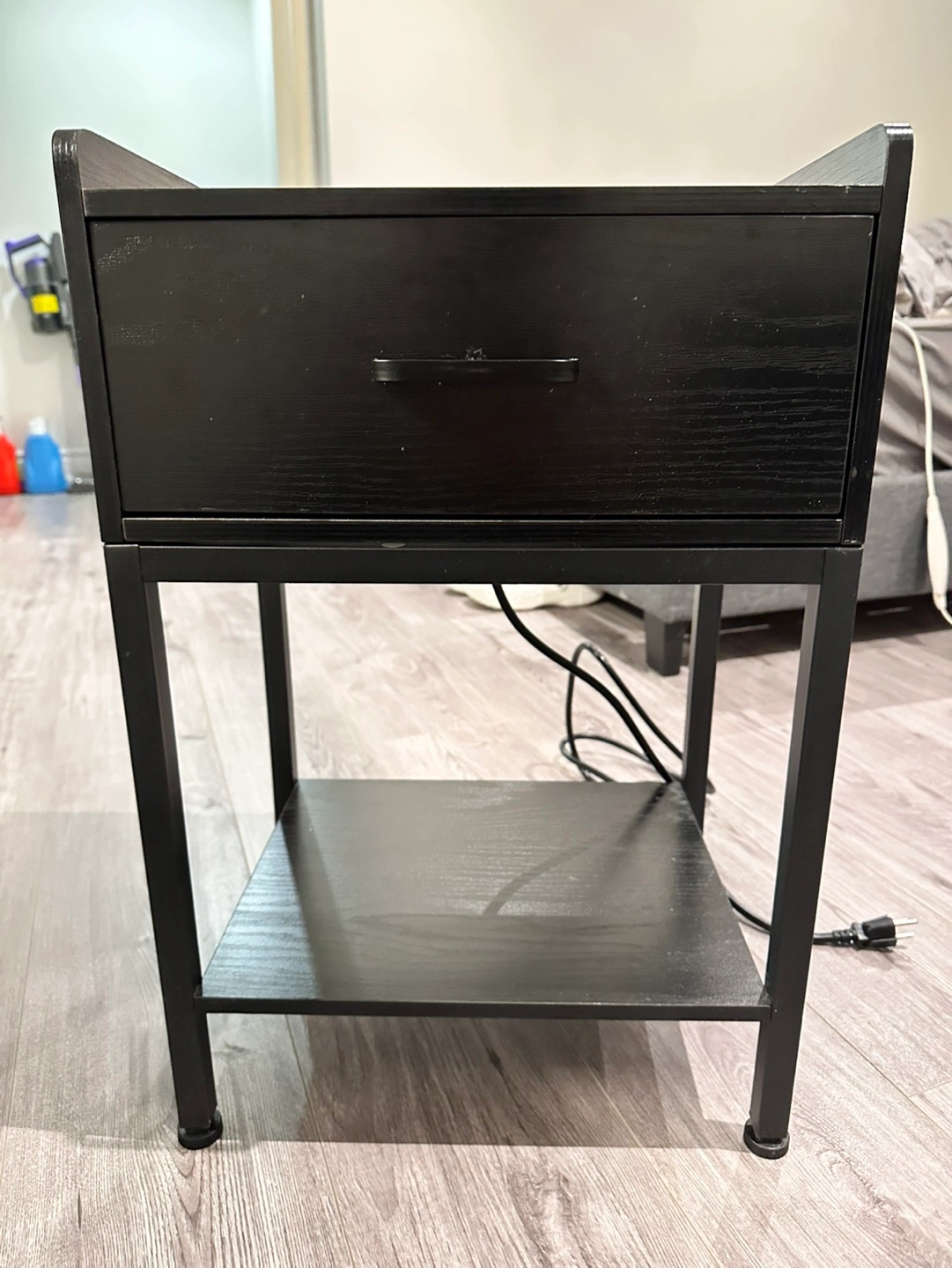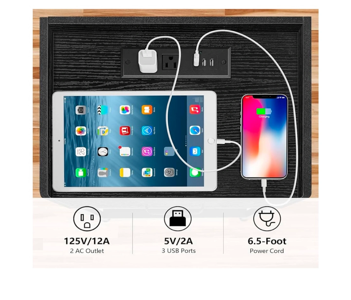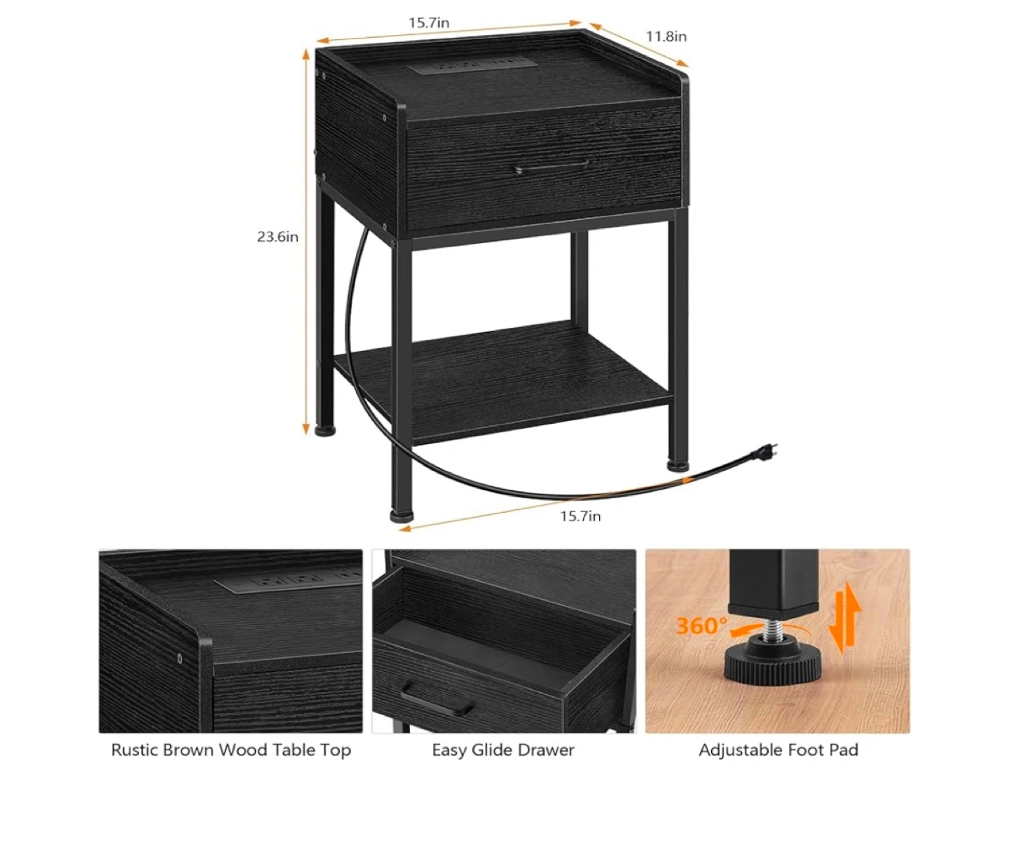 【Nightstand with Charging Station】With 2 Standard Plug Outlets, 3 USB ports, and a 4.9 ft long cord, this end table allow you to charge your mobile phones, laptops, and other devices at the same time.