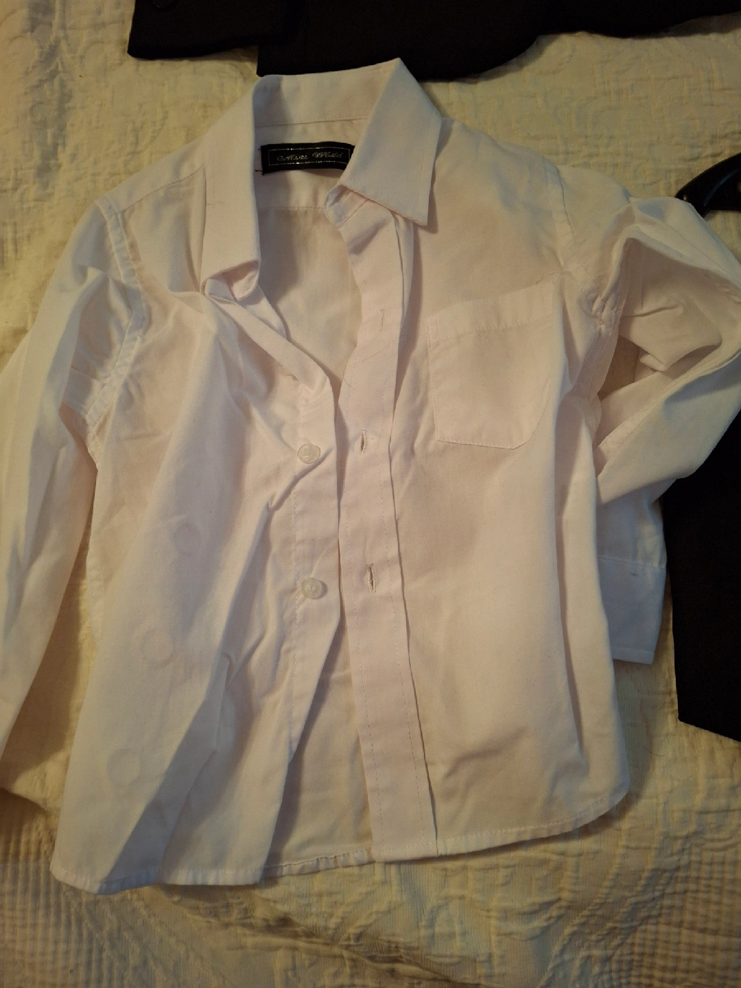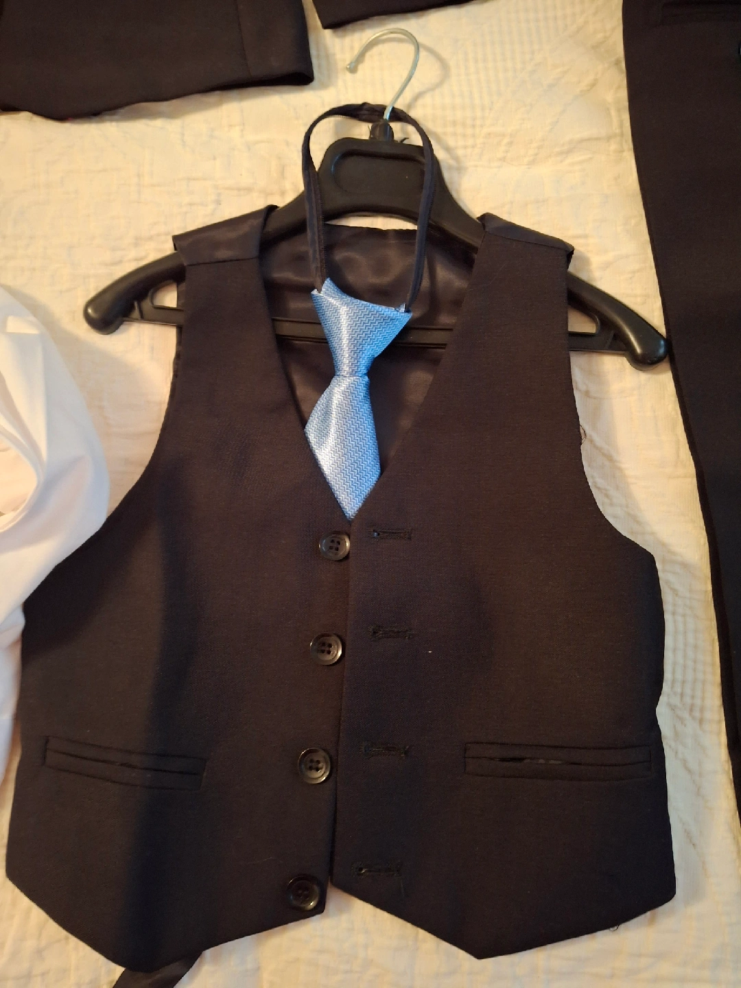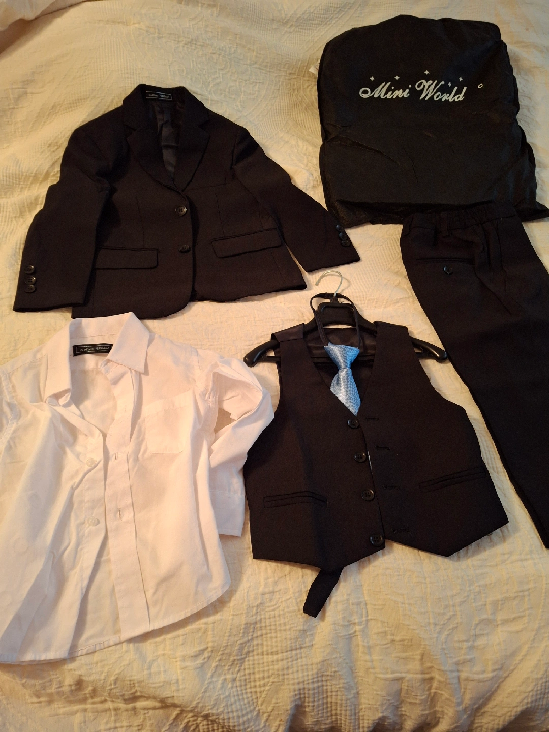 Selling a Mini World boys' suit set! It includes a jacket, pants, vest, shirt, and tie. Perfect for special occasions or dressing up. Comes with a garment bag for storage