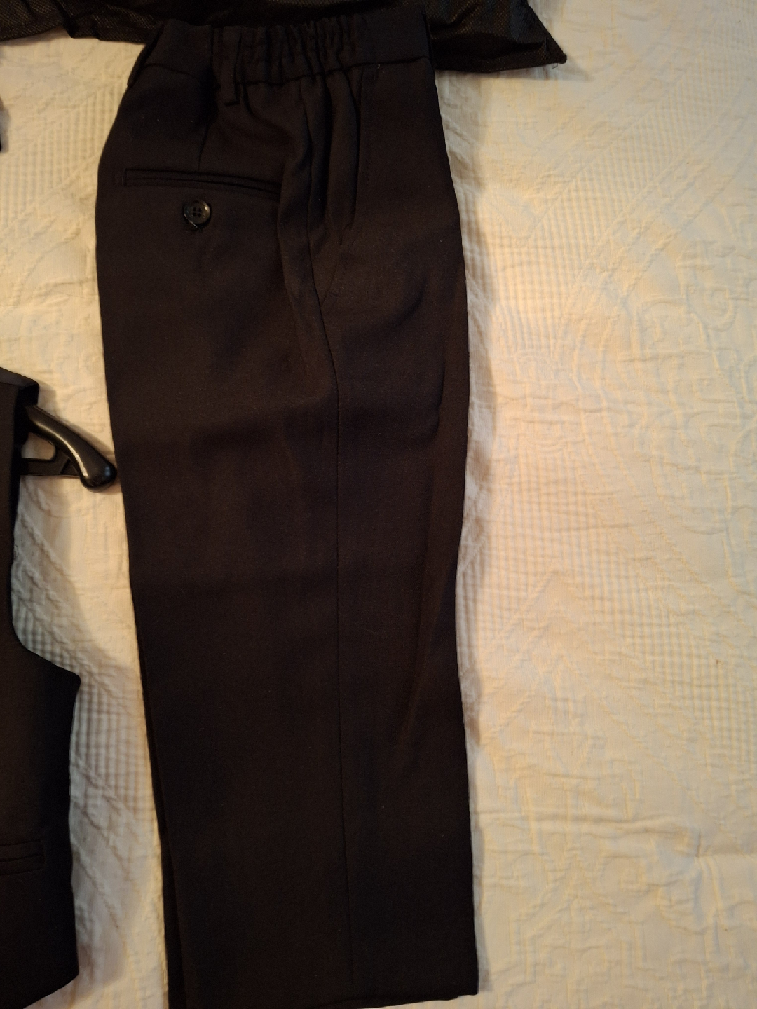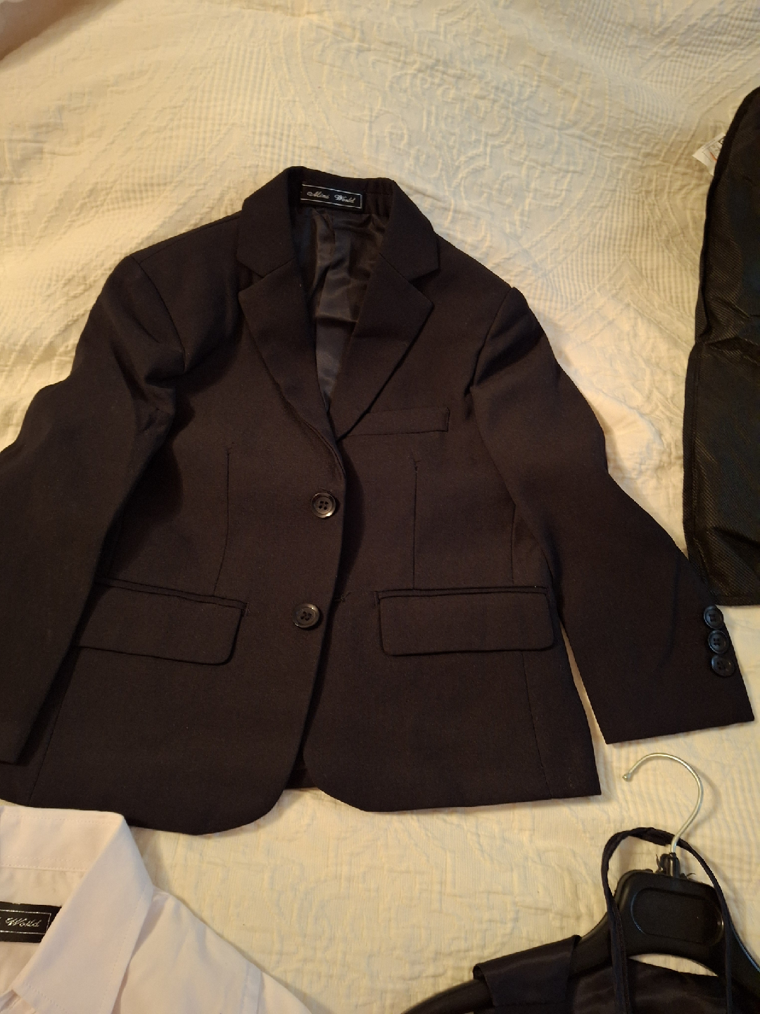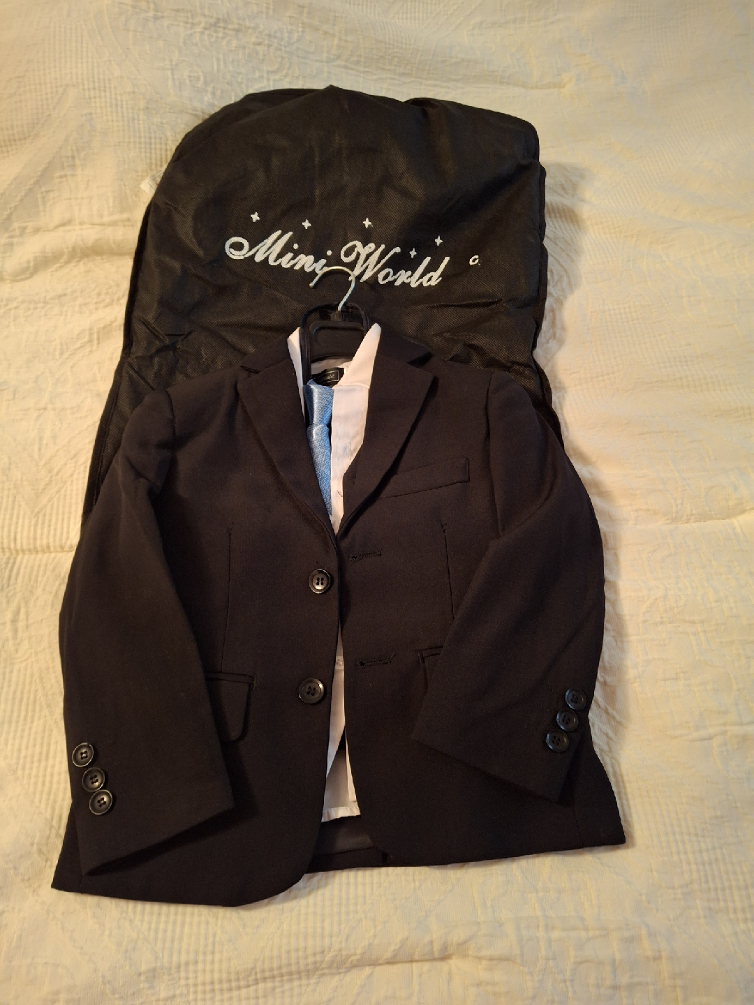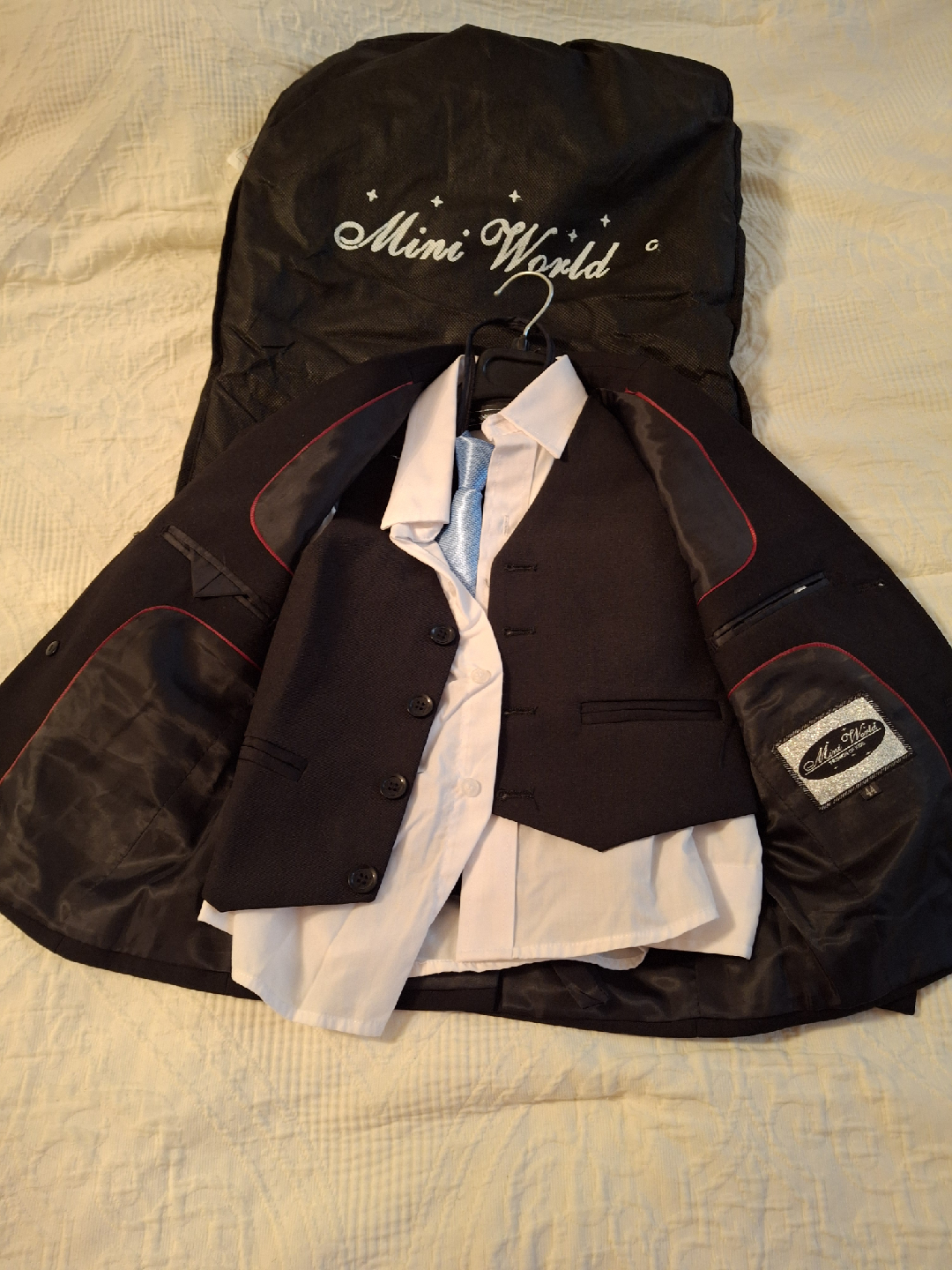 Selling a Mini World boys' suit set! It includes a jacket, pants, vest, shirt, and tie. Perfect for special occasions or dressing up. Comes with a garment bag for storage