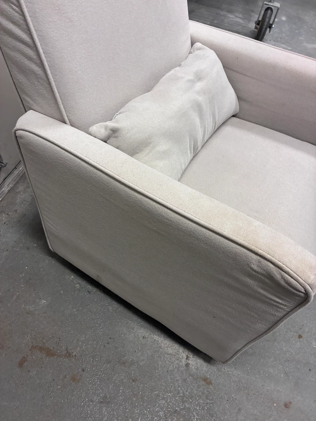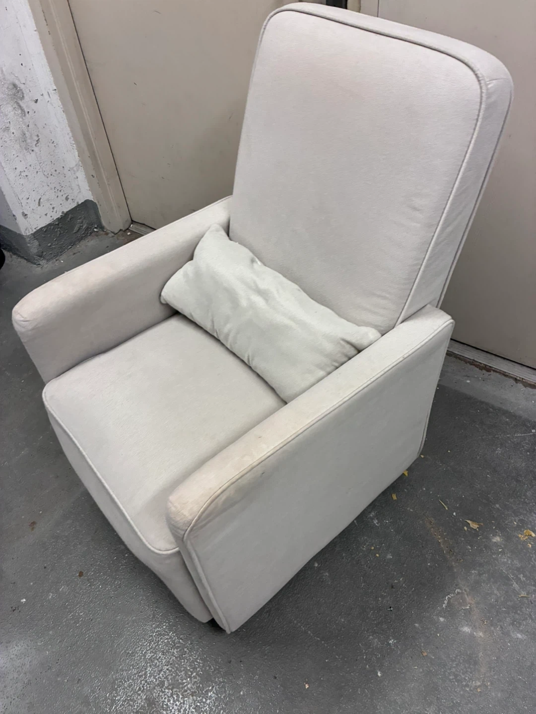 This is a comfortable light grey glider chair. It comes with a matching lumbar pillow for extra support. Upholstered in a soft fabric. Rocking and swevelling .