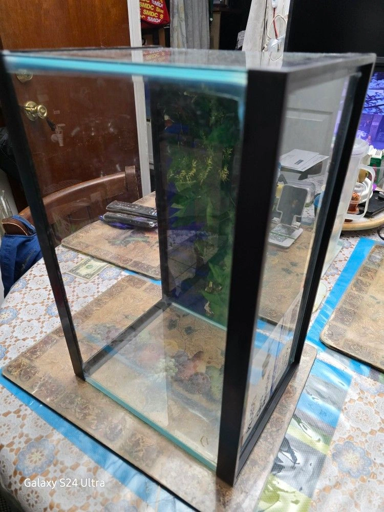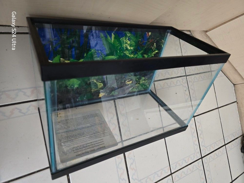 This Aqueon 5.5 gallon tank is great for smaller spaces or for starting out with a few fish. It has an open-glass design for easy access for feeding and cleaning. The clean silicone edges give it a sleek look. It's suitable for both freshwater and marine applications. High quality glass construction. Includes: background poster (installed), 3 pieces of decor worth $14. Tank Width: 8-3/8".